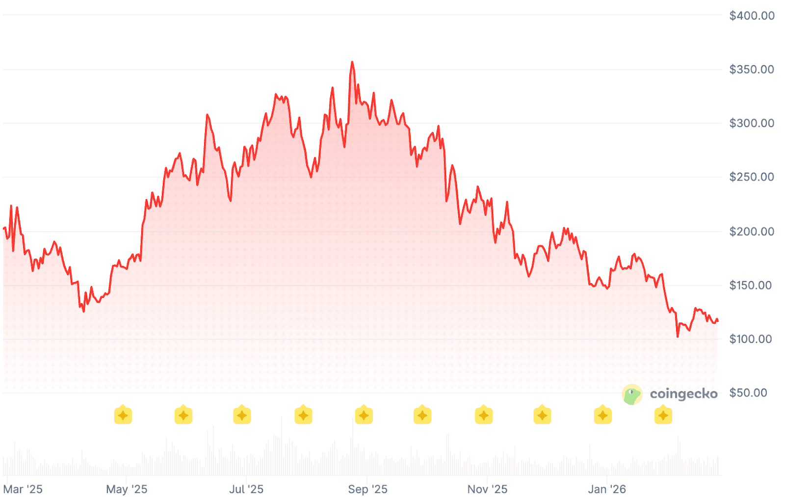 El máximo histórico de más de 661 dólares data de 2020, cuando Aave creció de manera explosiva durante el llamado verano DeFi.