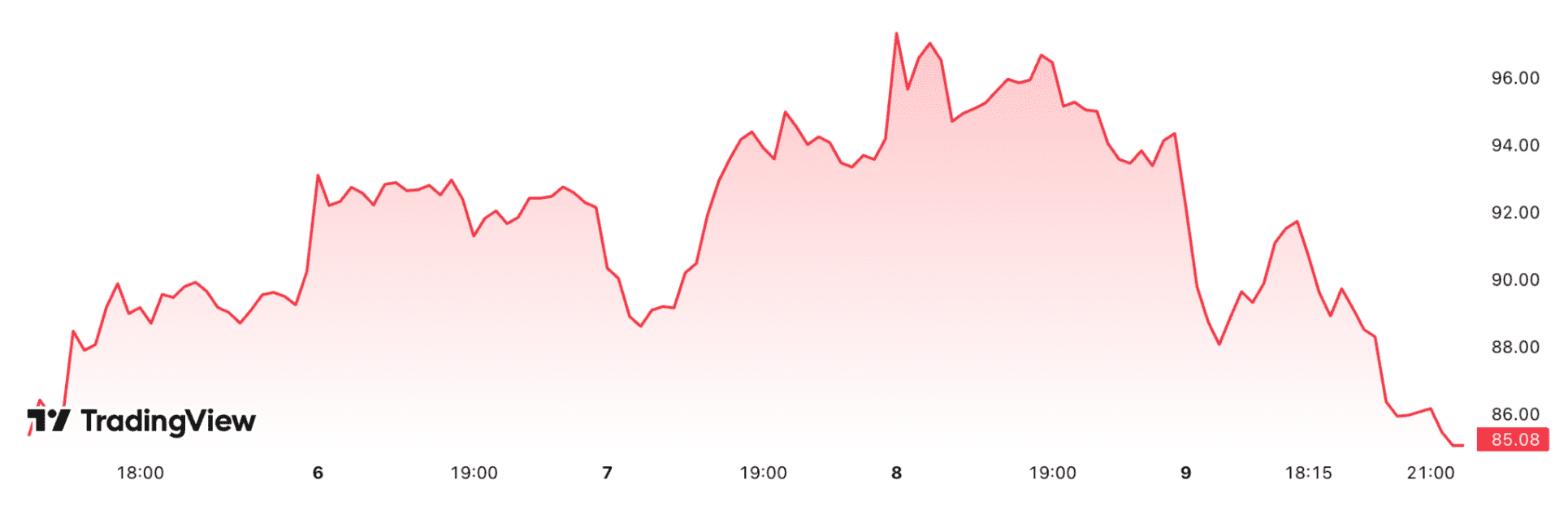 Circle comenzó la jornada bursátil en Estados Unidos rondando los 94,50 dólares. Al cierre del día, las acciones se situaron mucho más bajas, en 85,10 dólares, registrando una caída del 9,89% en un solo día.