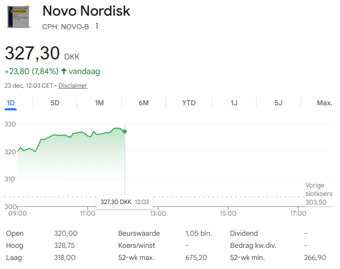 Novo Nordisk (NVO) se ha convertido en la primera farmacéutica en obtener la aprobación en Estados Unidos para una píldora de adelgazamiento basada en GLP-1. La acción ha reaccionado inmediatamente, subiendo hoy más del 7,8 por ciento.