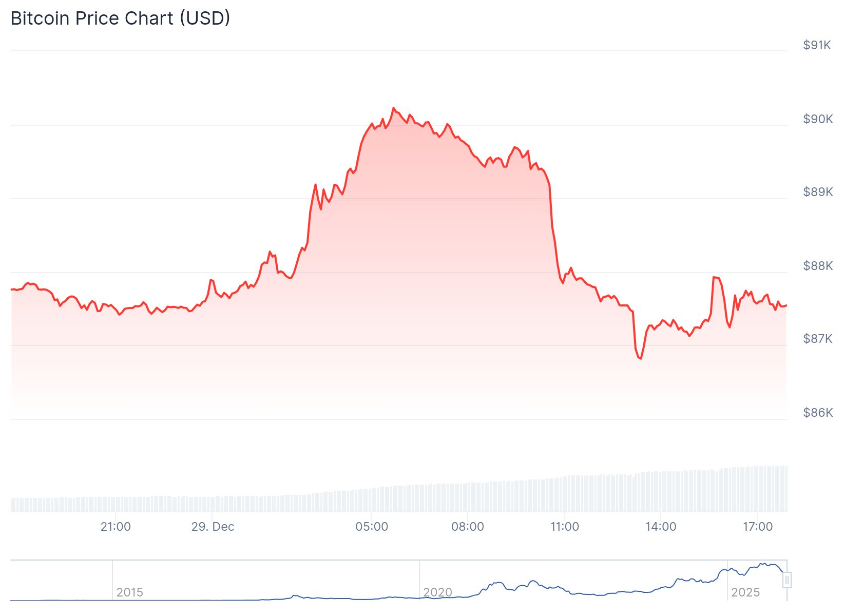 Esta madrugada, el precio de Bitcoin subió aproximadamente un 3 por ciento, de 87.600 dólares a un pico de 90.300 dólares. El punto más alto se alcanzó alrededor de las 6 de la mañana.