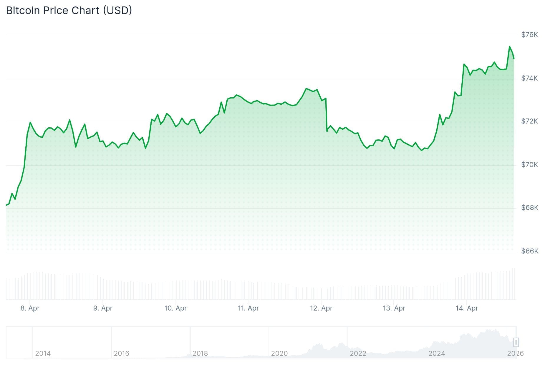La apertura de Wall Street a las 15:30 horas dio un nuevo impulso al precio. En una hora, Bitcoin subió un 2 por ciento, de 74.600 dólares a poco más de 76.000 dólares. El pico fue decenas de dólares más alto que donde el precio se estancó hace unas semanas.