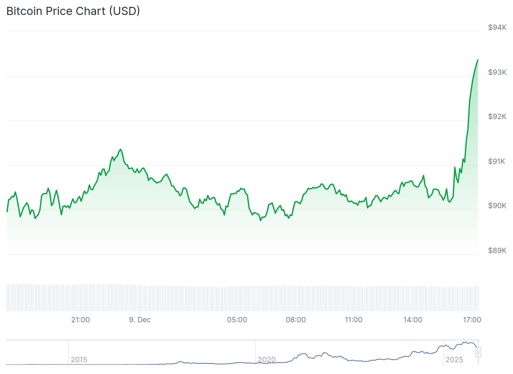 En solo una hora, el valor ha pasado de 90,200 dólares a 93,500 dólares. Esto implica un impresionante aumento del 3,6 por ciento.