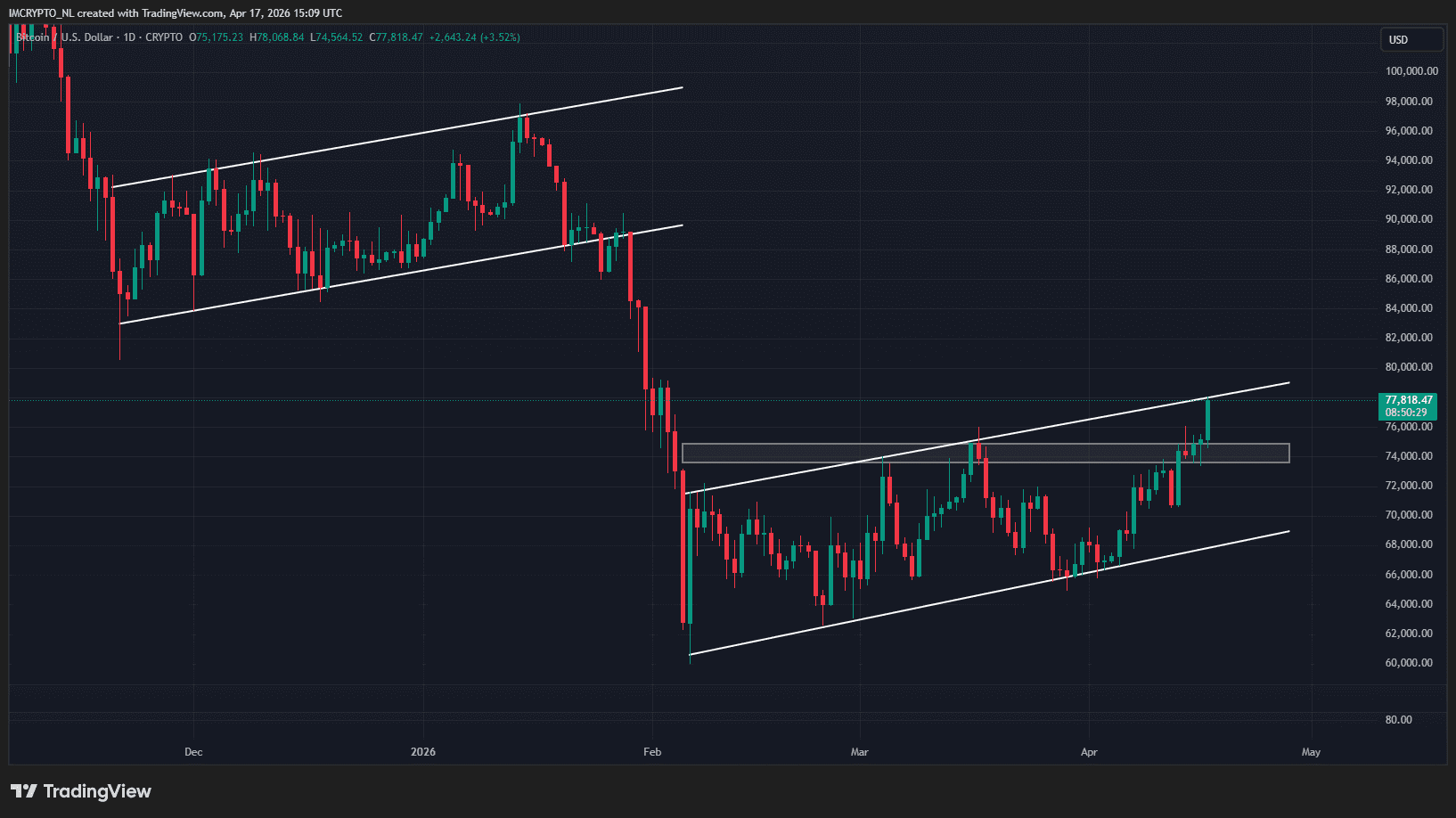 Bitcoin ahora se encuentra en un punto crucial del gráfico: la parte superior del bearflag en el que ha estado moviéndose durante meses. Es la tercera vez que se prueba esta línea y se espera que no se repita la acción de precio de enero.
