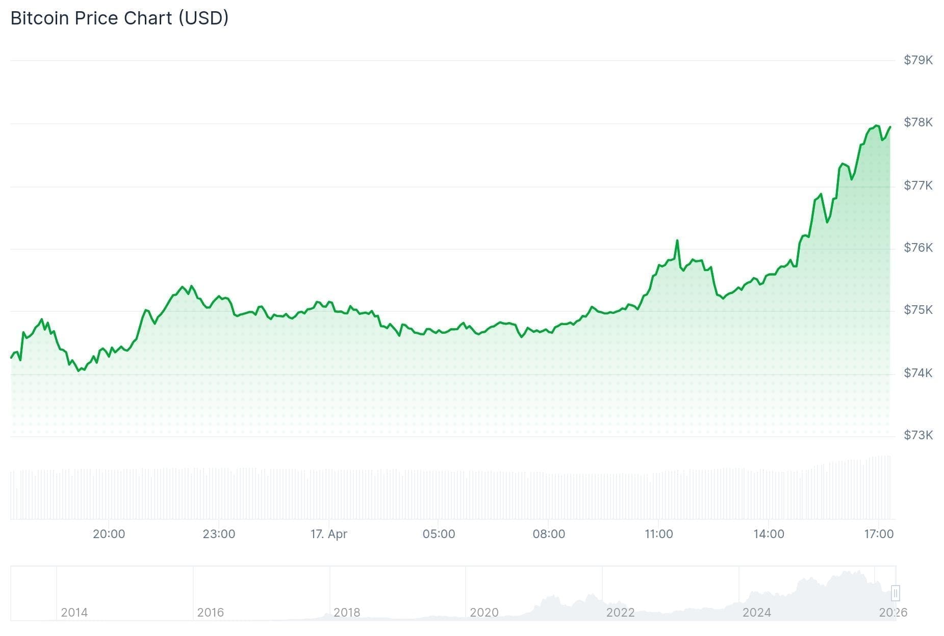 Alrededor de las 15:00 horas se divulgó la gran noticia y en dos horas el precio de Bitcoin subió de 76.200 dólares a un pico de 78.000 dólares, su nivel más alto desde el 3 de febrero.