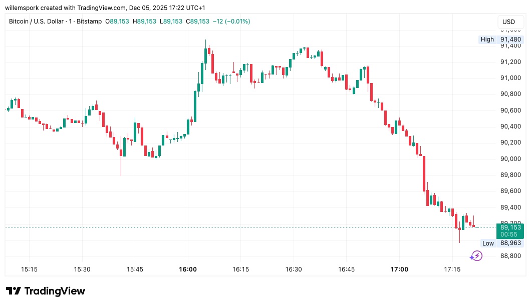 El precio de Bitcoin subió brevemente a 91.480 dólares, pero luego cayó significativamente. En el momento de escribir, BTC se sitúa en 88.753 dólares, una disminución de más del dos por ciento en comparación con 24 horas atrás.