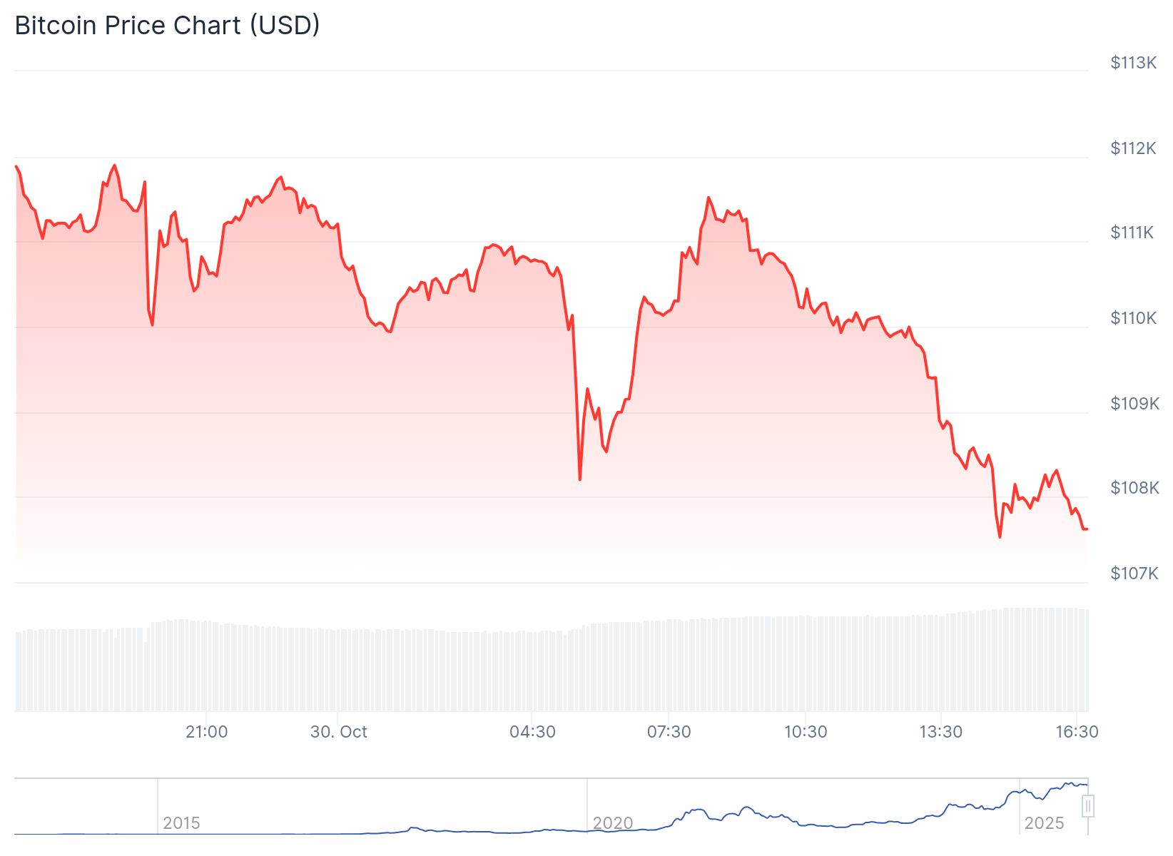 Tras la reunión entre los dos líderes, la precio de Bitcoin cayó de unos 110.700 dólares a apenas por encima de 108.000. Después rebotó por encima de 111.000 dólares, una vez que se hizo público qué acuerdos se habían alcanzado. Pero desde las 09:00 la cotización no ha hecho más que bajar.