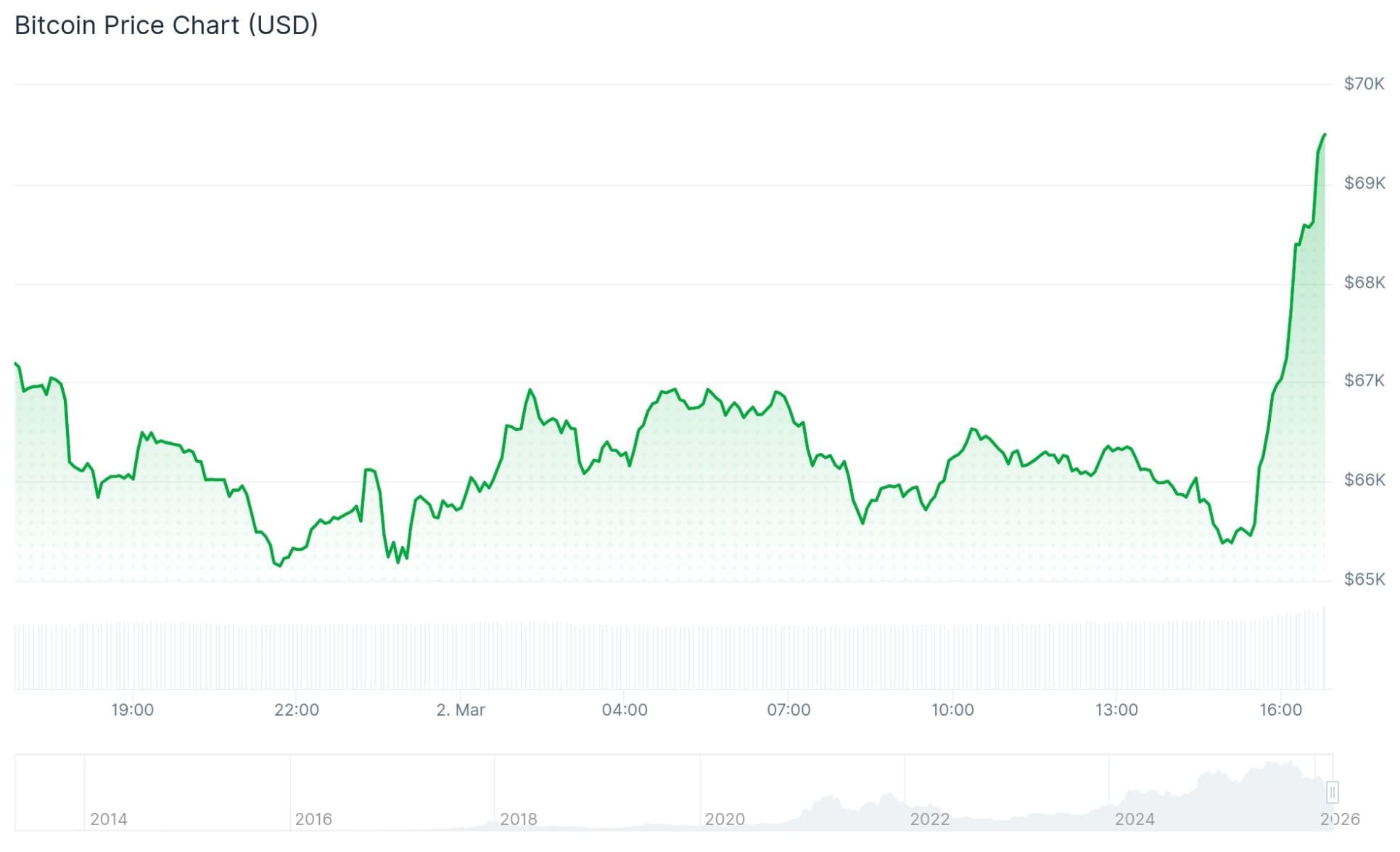El precio de Bitcoin ha subido de 65.600 dólares a un nivel actual de 69.500 dólares. Esto representa un impresionante aumento de casi el 6 por ciento, alcanzando su punto más alto desde el 25 de febrero.