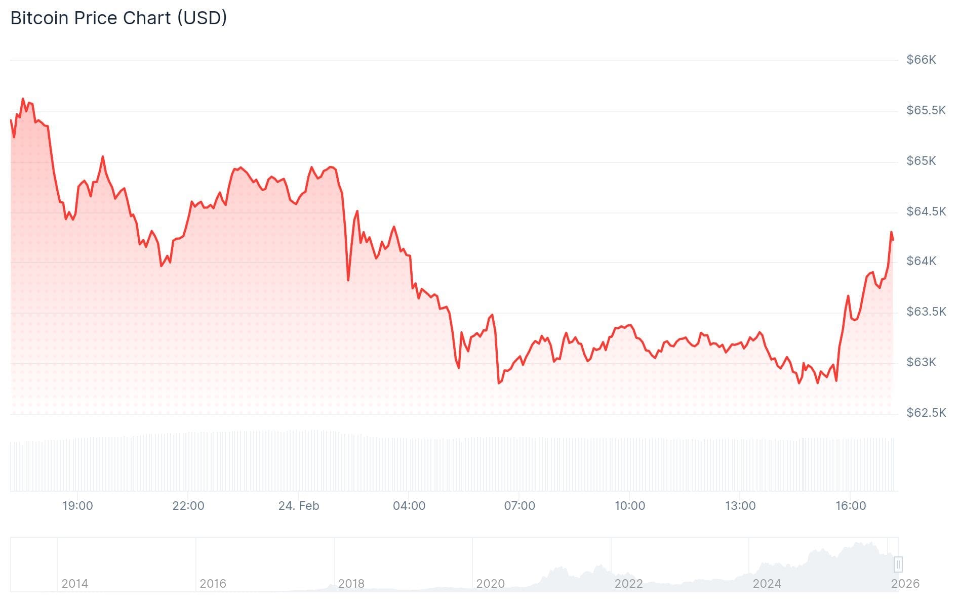 Al momento de escribir, el precio de BTC está en 64.385 dólares, un 1,65% por debajo de hace 24 horas. En euros, la mayor criptomoneda se cotiza a 54.671.