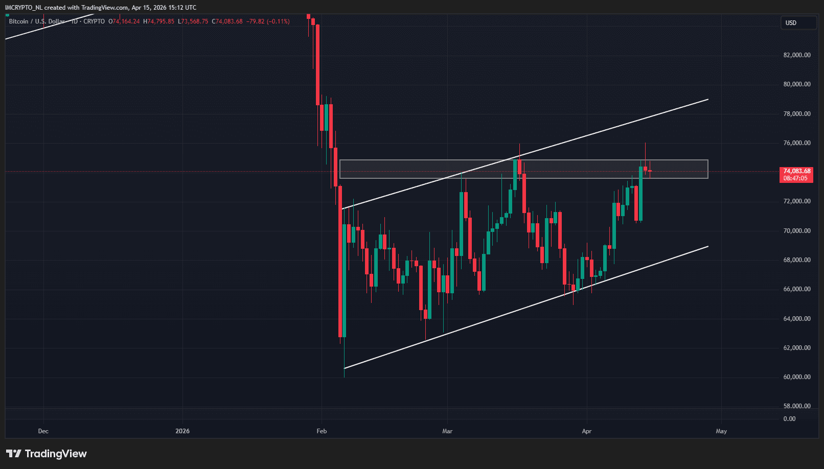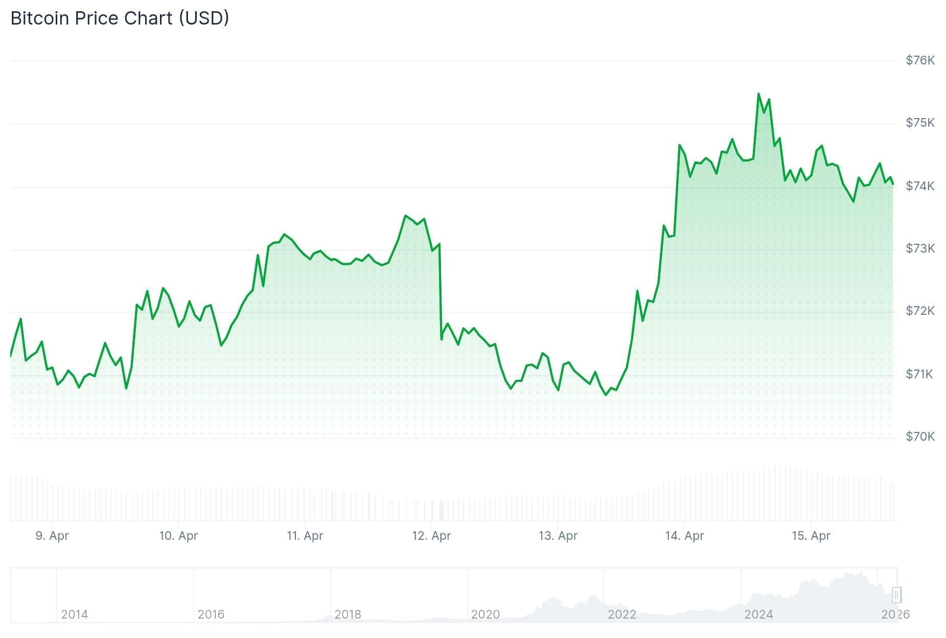 Después de alcanzar un pico de 76,000 dólares, el precio de Bitcoin descendió hacia los 74,000 dólares. Hoy ha permanecido alrededor de este nivel durante todo el día.
