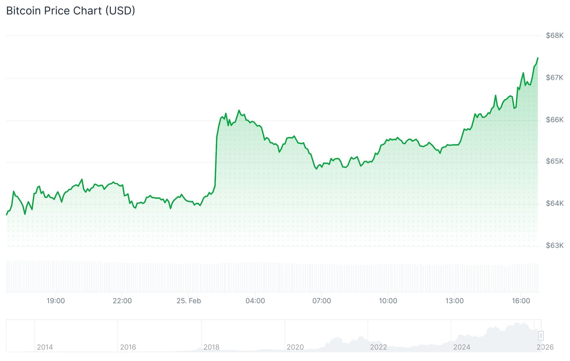 Hoy, Bitcoin ha subido de 64.000 dólares a un nivel actual de aproximadamente 67.500 dólares, lo que representa una ganancia del 5,4 por ciento. Ayer alcanzó un mínimo de 62.500 dólares y desde entonces el precio ha recuperado un 7,7 por ciento.
