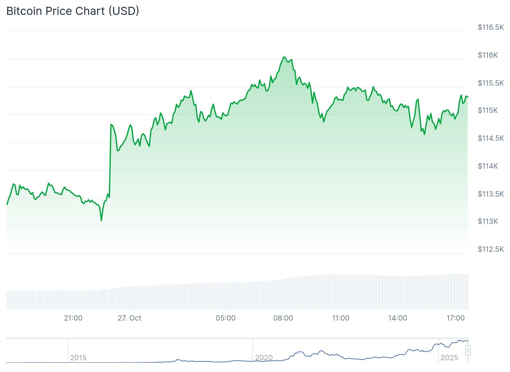 Esta mañana ya pudiste leer sobre el fuerte salto que Bitcoin dio anoche. De la nada, el precio pasó de 113.300 dólares a casi 115.000 dólares. Durante la madrugada, la cotización no hizo más que seguir subiendo y alrededor de las 08:00 se alcanzó un pico de 116.400 dólares.