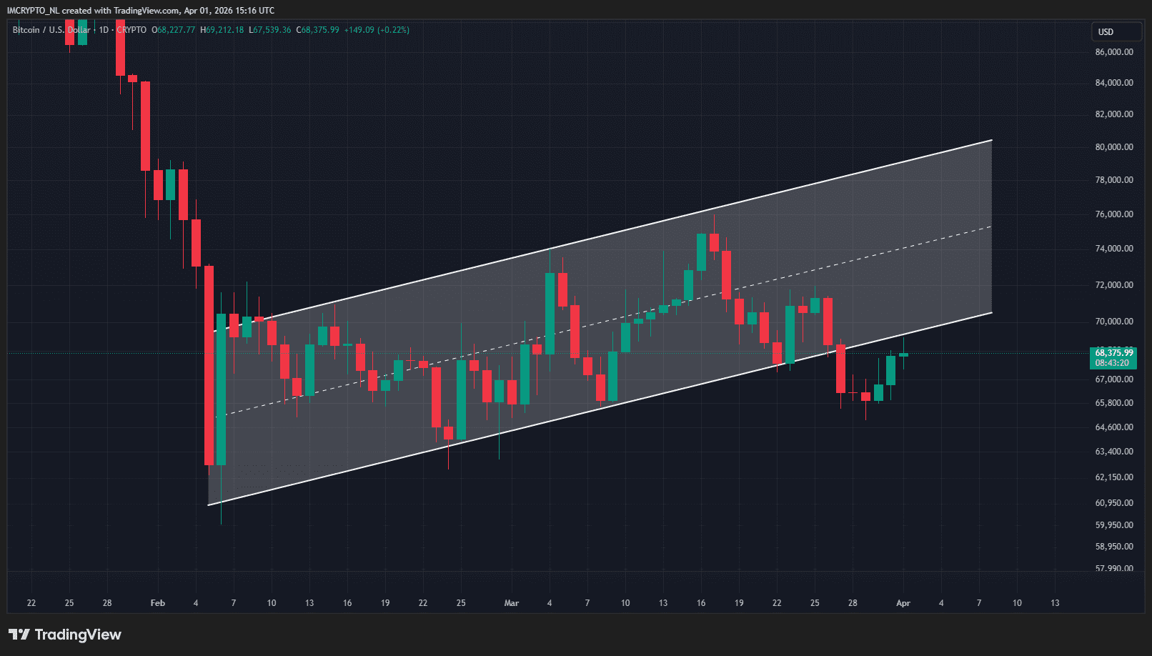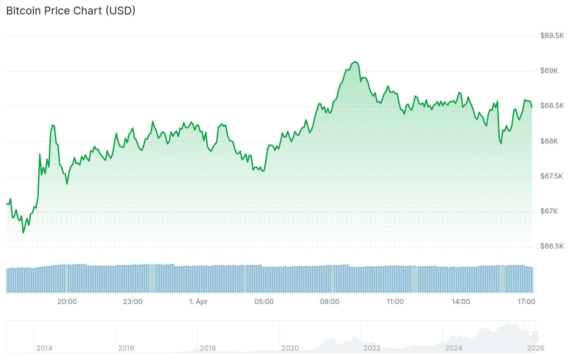 La vela diaria se abrió en 68.200 dólares y actualmente el precio está aproximadamente 300 dólares por encima de ese valor.