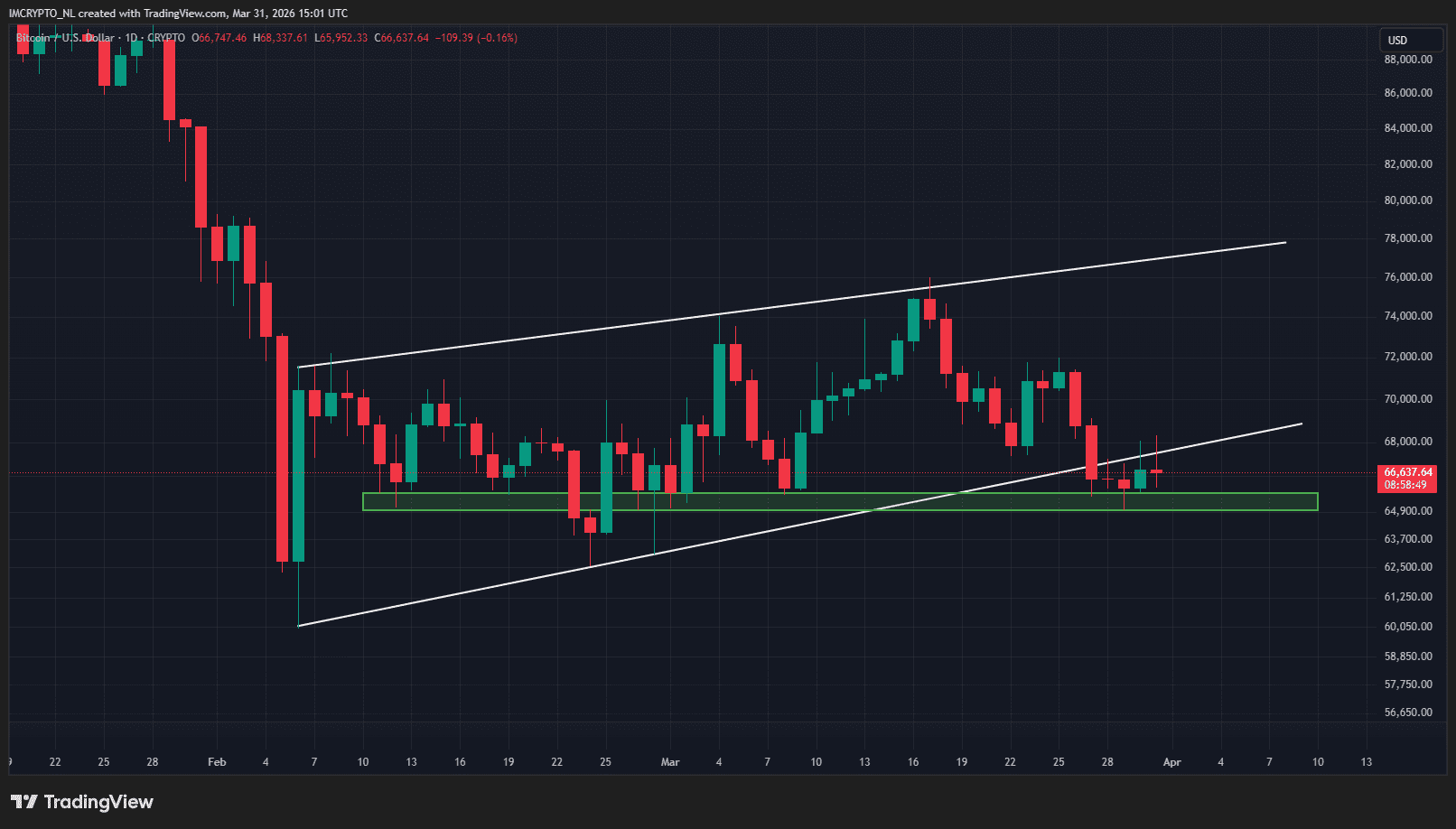 Entre las 10:00 y las 12:00 se vendieron muchas Bitcoins en el mercado. El precio cayó más del 2 por ciento, de 67,500 dólares a un mínimo de 66,000.
