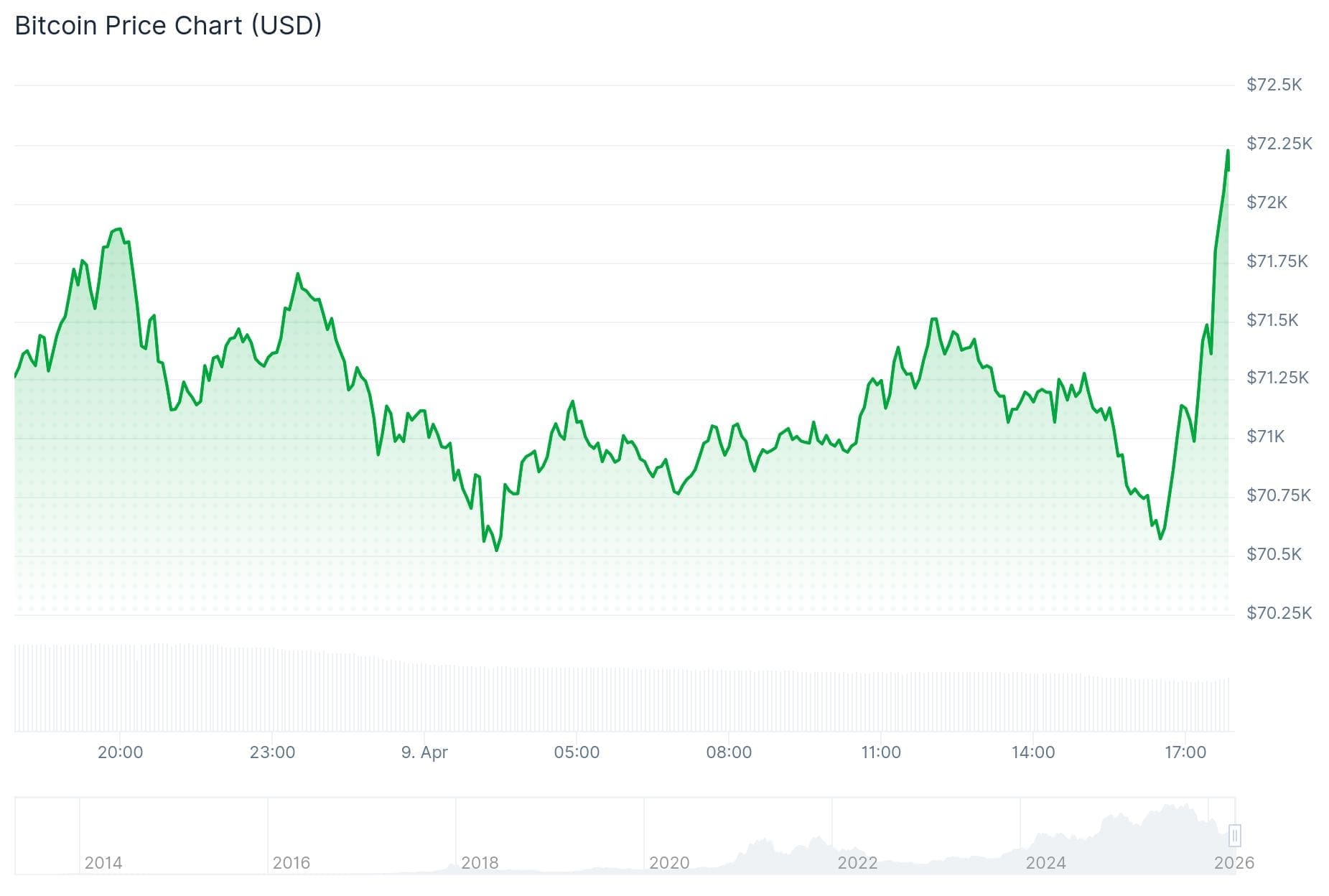 El precio de Bitcoin alcanzó un mínimo de aproximadamente 70.600 dólares alrededor de las 16:30 horas, pero ahora está de nuevo por encima de los 72.000 dólares. Al mismo tiempo, también vemos una recuperación en los precios de Wall Street.