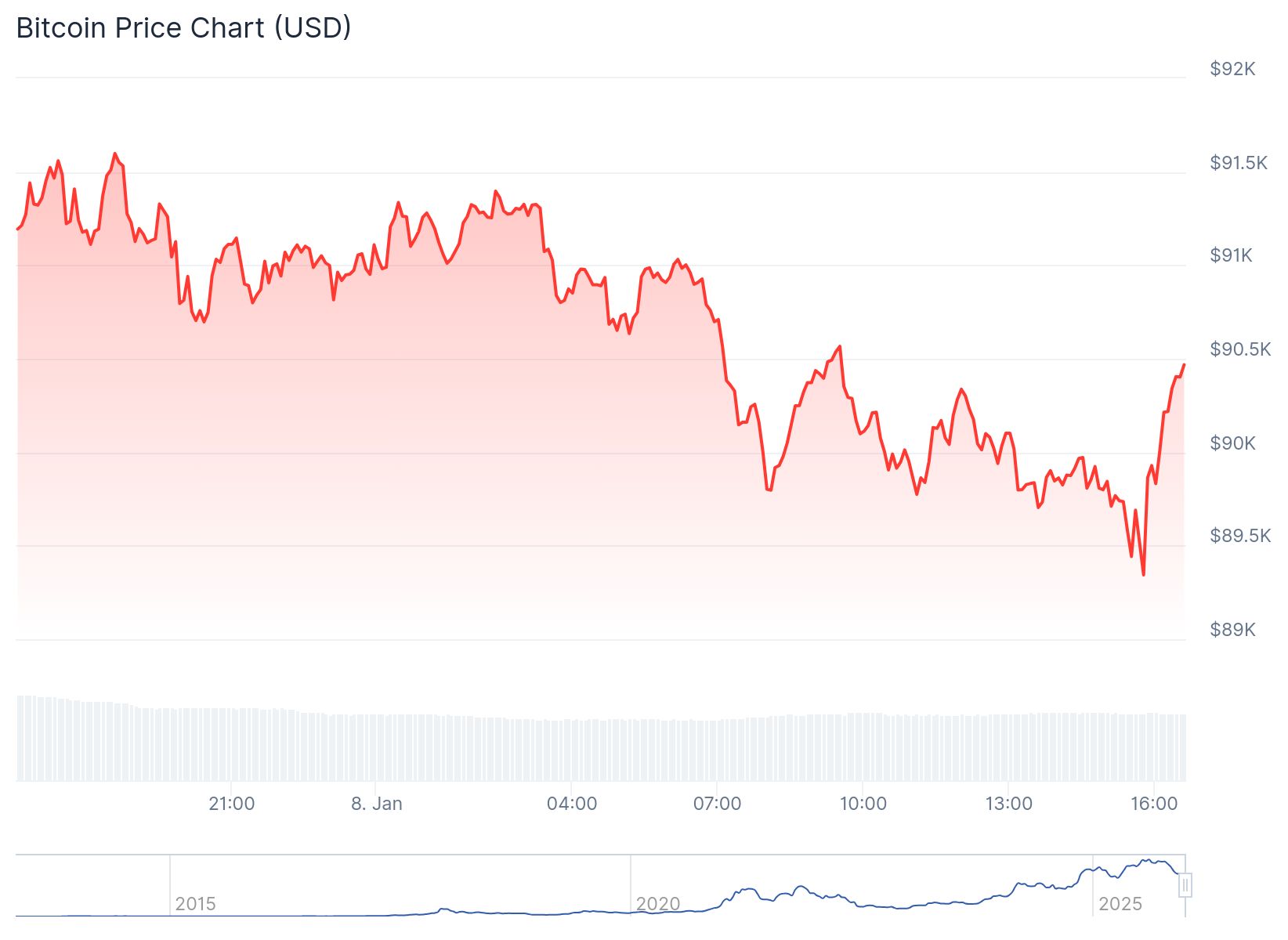 Desde las 15:45 horas, Bitcoin se ha movido al alza. El precio ha subido de un mínimo de aproximadamente 89.300 dólares a 90.600 dólares. Esto representa un incremento de casi el 1,5 por ciento.
