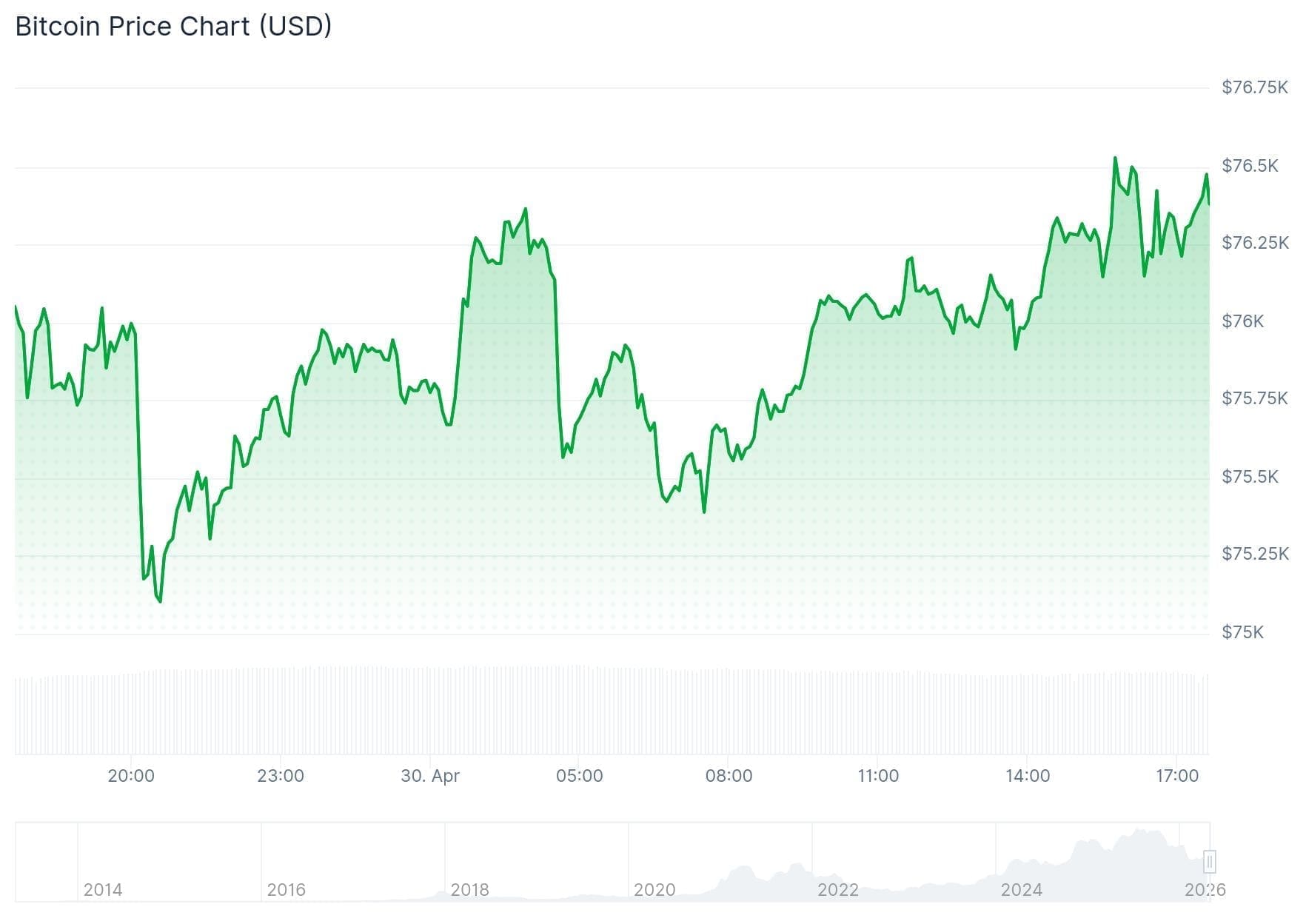 Al igual que ayer por la tarde, el precio se sitúa nuevamente por encima de los 76.000 dólares. La incógnita es si podrá mantenerse por encima de este nivel.