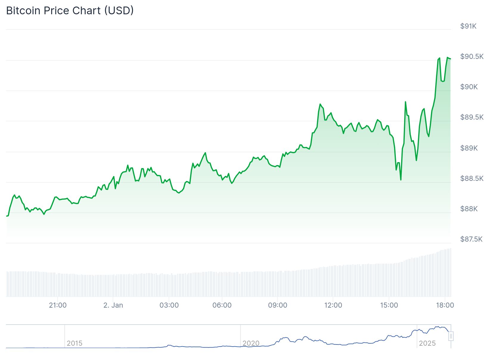 Actualmente, Bitcoin muestra una ganancia del 2,11 por ciento, lo que sería su mejor día desde el 19 de diciembre. Pero lo más importante es que ahora su cotización está por encima de los 90,000 dólares.