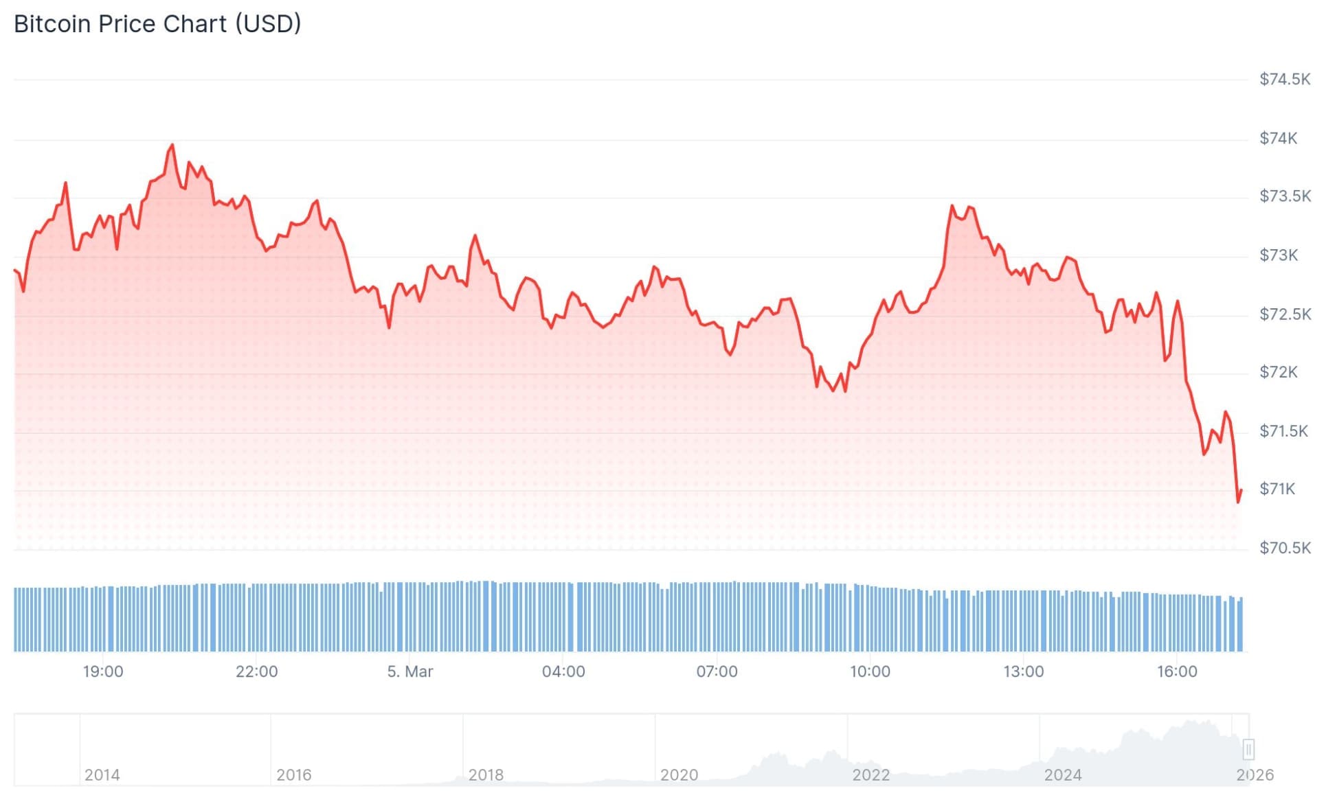 Al momento de escribir, el precio de BTC es de 70.872 dólares, un 2,72% menos que hace 24 horas. En euros, se paga ahora 61.305 por la mayor criptomoneda.