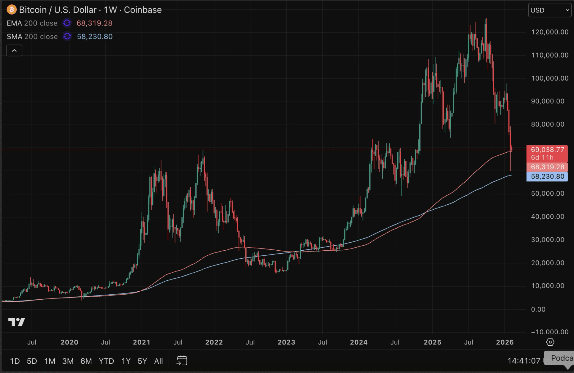 Aunque el comportamiento del precio de Bitcoin se asemeja a un mercado bajista, la criptomoneda ha llegado a un punto interesante. Bitcoin parece encontrar apoyo en el promedio móvil exponencial de 200 semanas (lÃnea roja). En el mercado bajista de 2022, Bitcoin finalmente cayó por debajo de este soporte, pero ahora la reacción parece más fuerte.