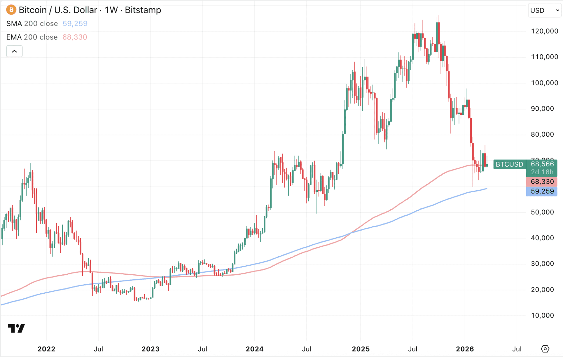 Al mismo tiempo, el precio de Bitcoin se mantiene en un nivel crucial, que oscila entre los 68.000 y 69.000 dólares. En el gráfico semanal, encontramos en 68.330 dólares (línea roja) el promedio móvil exponencial de 200 semanas.