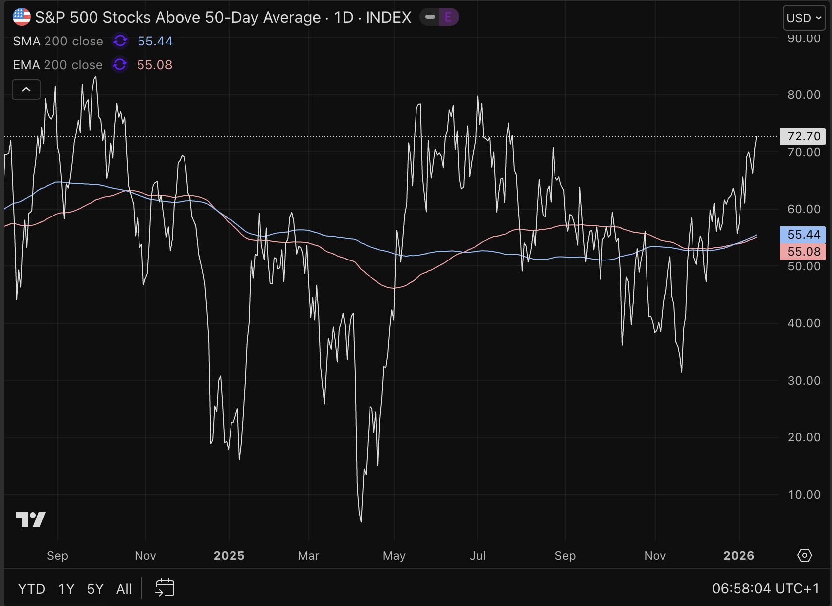 Además, la participación está en aumento. Actualmente, el 72 por ciento de las empresas del S&P 500 cotizan por encima de su promedio de 50 días. Este es un porcentaje relativamente alto, lo que indica que las subidas se sostienen de manera bastante amplia.