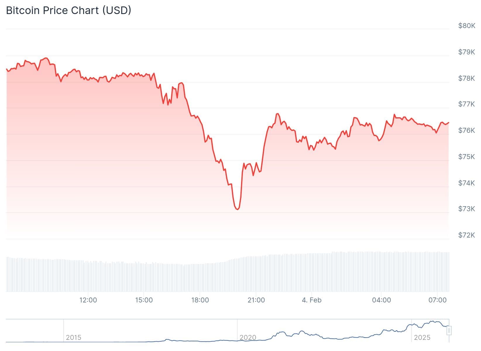 En dos horas, el precio de Bitcoin se recuperó por encima de los 76.000 dólares.