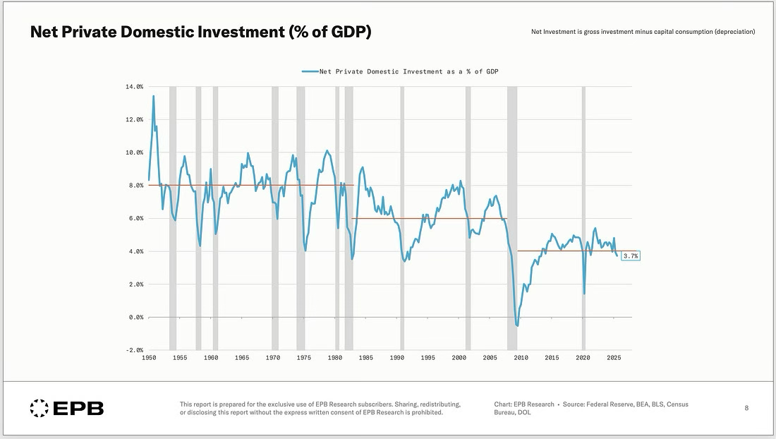 Según EPB Research, las causas son el envejecimiento de la población, la globalización, el cambio hacia software de rápida depreciación, la ingeniería financiera en lugar de la reinversión y los grandes déficits gubernamentales que desplazan las inversiones privadas.