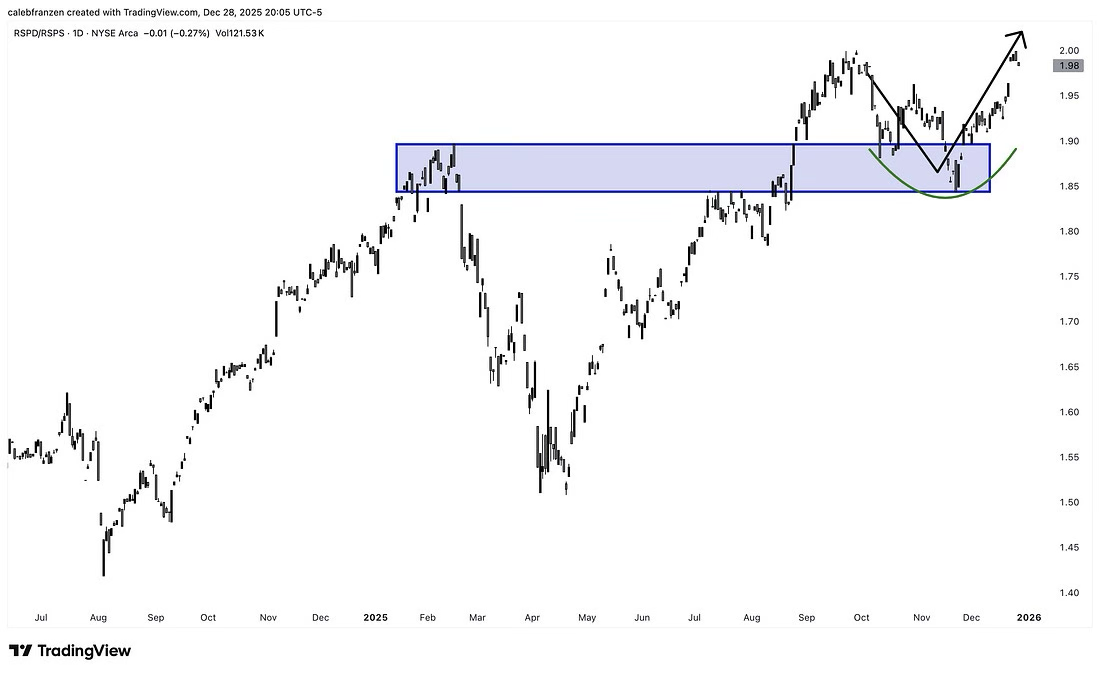 Eso lo vemos, por ejemplo, en la relación entre los ETF RSPD y PSPS. El primero se centra en empresas que facilitan el consumo no esencial. Piensa en automóviles, viajes, lujo y comercio minorista. Mientras que PSPS ofrece productos básicos como alimentos, bebidas y artículos para el hogar.