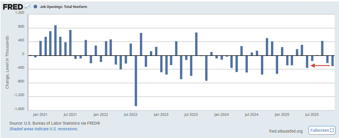 El último informe JOLTS de Estados Unidos muestra una clara desaceleración del mercado laboral. El número de vacantes disminuyó en diciembre en 303.000, la mayor caída mensual desde junio y la segunda más grande de todo 2025. Al mismo tiempo, la cifra de octubre se revisó a la baja significativamente. En total, el número de vacantes se situó en 7,42 millones, el nivel más bajo desde septiembre de 2024 y claramente por debajo de las expectativas.
