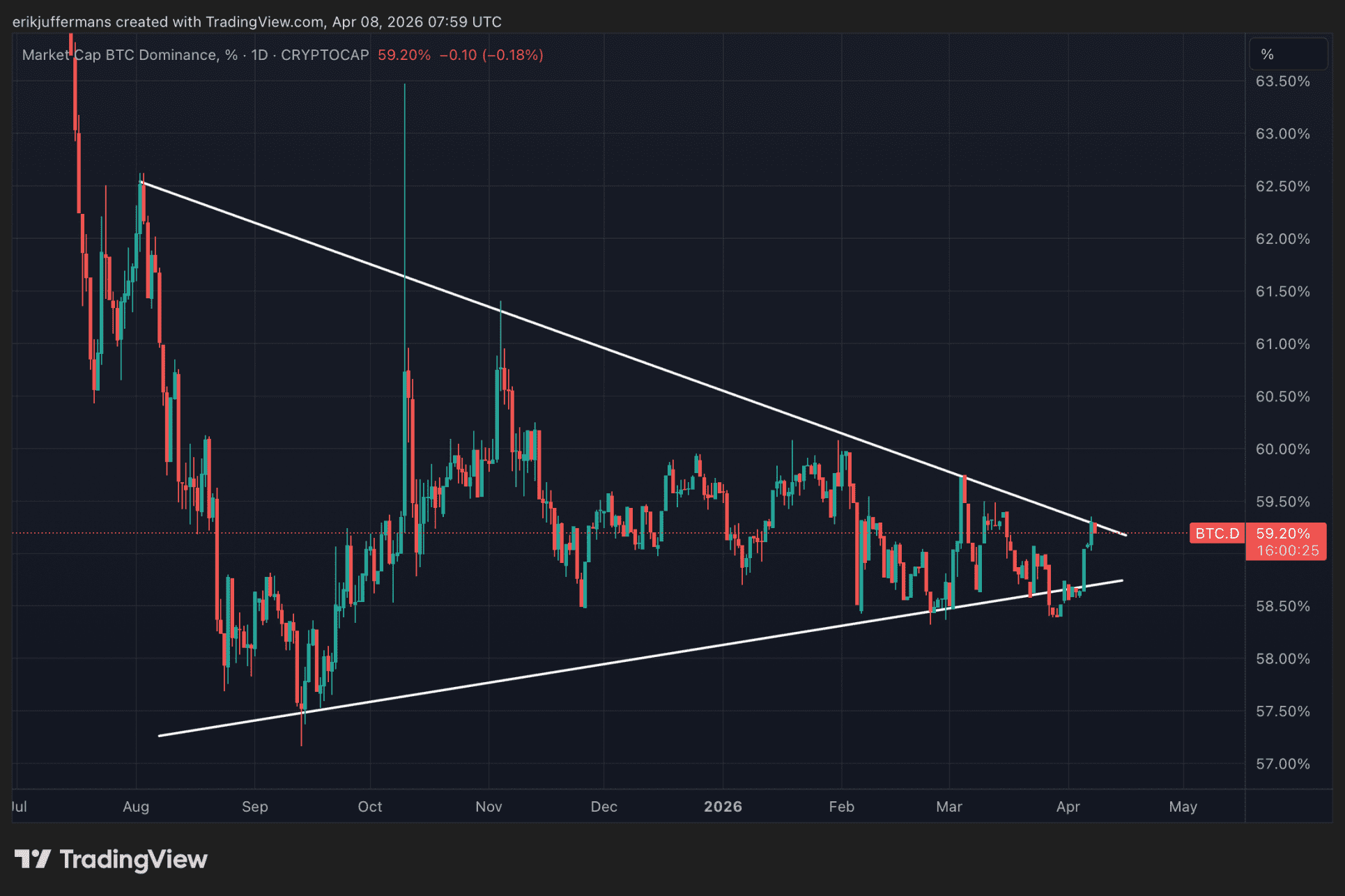 En las próximas semanas, la dominancia de Bitcoin debe elegir dirección. Para los inversores en altcoins, esto es especialmente relevante. Si la dominancia rompe al alza, generalmente significa que las altcoins se quedan atrás respecto a Bitcoin. Si la dominancia rompe a la baja, entonces hay espacio para un rally de altcoins.