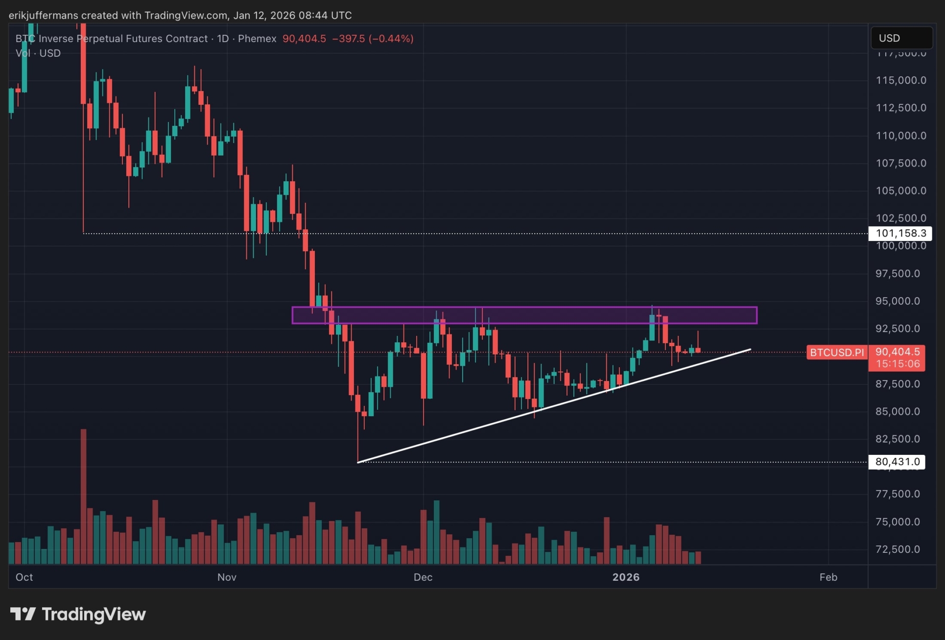 El escenario bajista es una caída por debajo de la línea de tendencia ascendente. En este caso, debemos prepararnos para una caída más profunda hacia los 80.000 dólares.