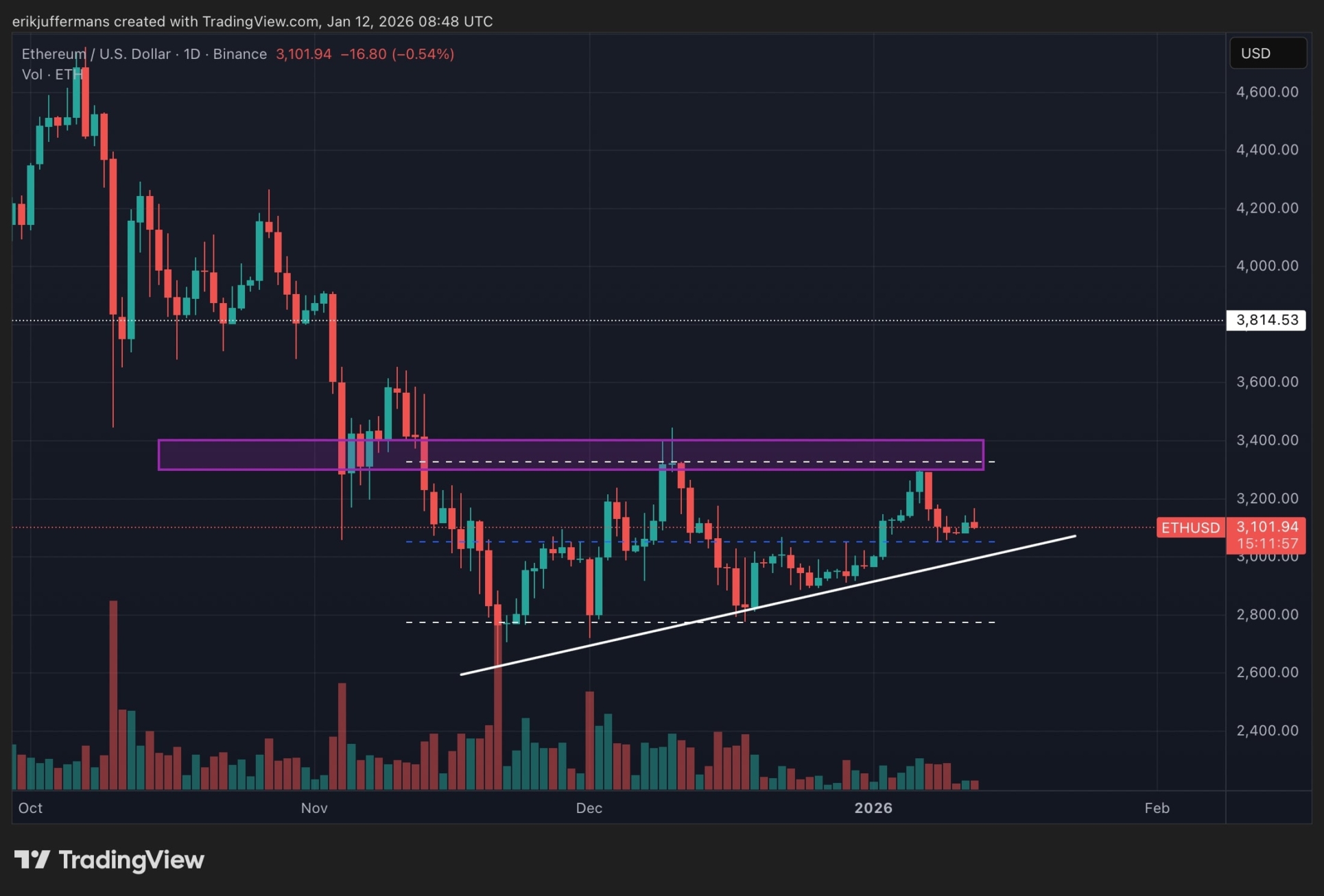 El comportamiento del precio de Ethereum es casi idéntico al de Bitcoin. Una subida a través de la zona de resistencia púrpura entre 3.300 y 3.400 dólares abriría la puerta a un rally hacia los 3.800 dólares. Sin embargo, si BTC no se mantiene, ETH podría descender rápidamente hacia los 2.700 dólares.
