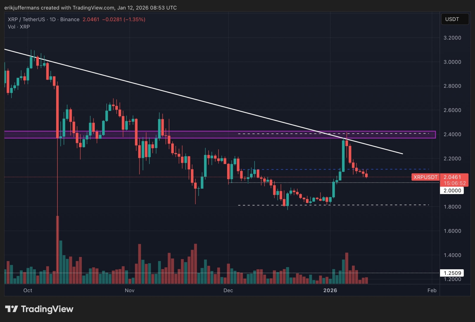 Mientras que BTC y ETH han mantenido cierta estabilidad en las últimas semanas, Ripple (XRP) ha mostrado un comportamiento diferente. Desde principios de año, XRP ha sido muy volátil. El precio subió a 2,40 dólares y luego cayó rápidamente hacia los 2 dólares.