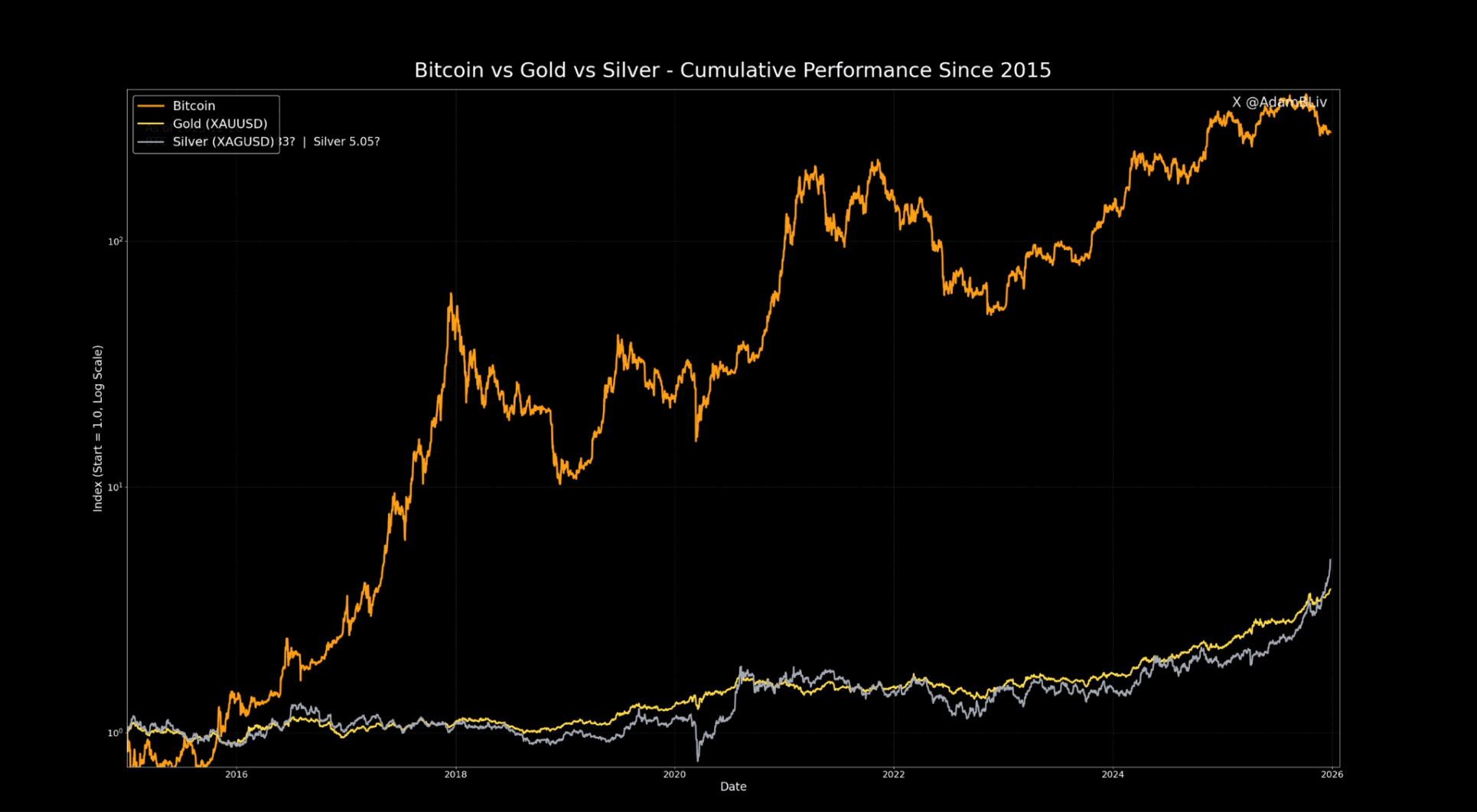 El autor y analista Adam Livingston destaca que desde 2015, Bitcoin ha tenido un rendimiento mucho mejor que los metales preciosos. En un mensaje en X, escribe que Bitcoin ha aumentado un 27.701 por ciento en diez años. En el mismo período, la plata tuvo un incremento del 405 por ciento y el oro del 283 por ciento.