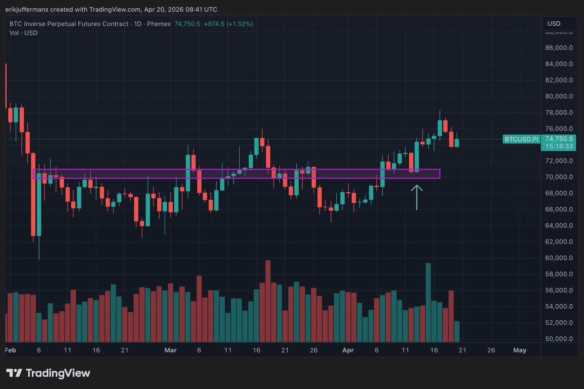 Esta vez, sí lo logró. El precio probó exitosamente la zona de los 70.000 dólares como soporte. Según Juffermans, esto marca una diferencia importante respecto a intentos anteriores y es una señal de que los compradores en este nivel se están fortaleciendo.