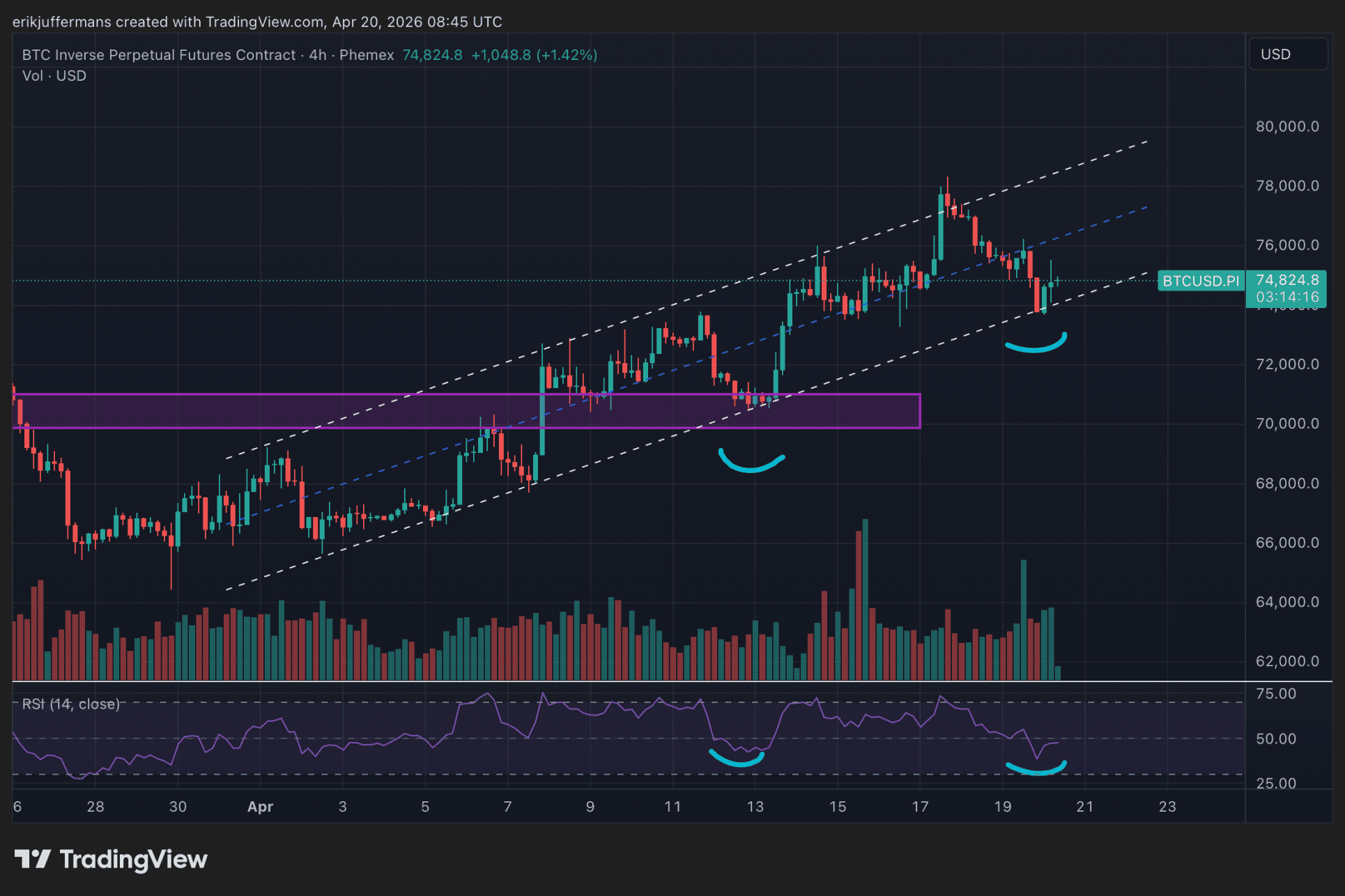 Esto significa que el precio registra un pico más alto mientras que el valor del RSI, que mide la fuerza del precio, muestra un pico más bajo. Según Juffermans, esto indica que el rally actual podría continuar a corto plazo. El nivel psicológico de 80.000 dólares es un objetivo lógico para el precio.