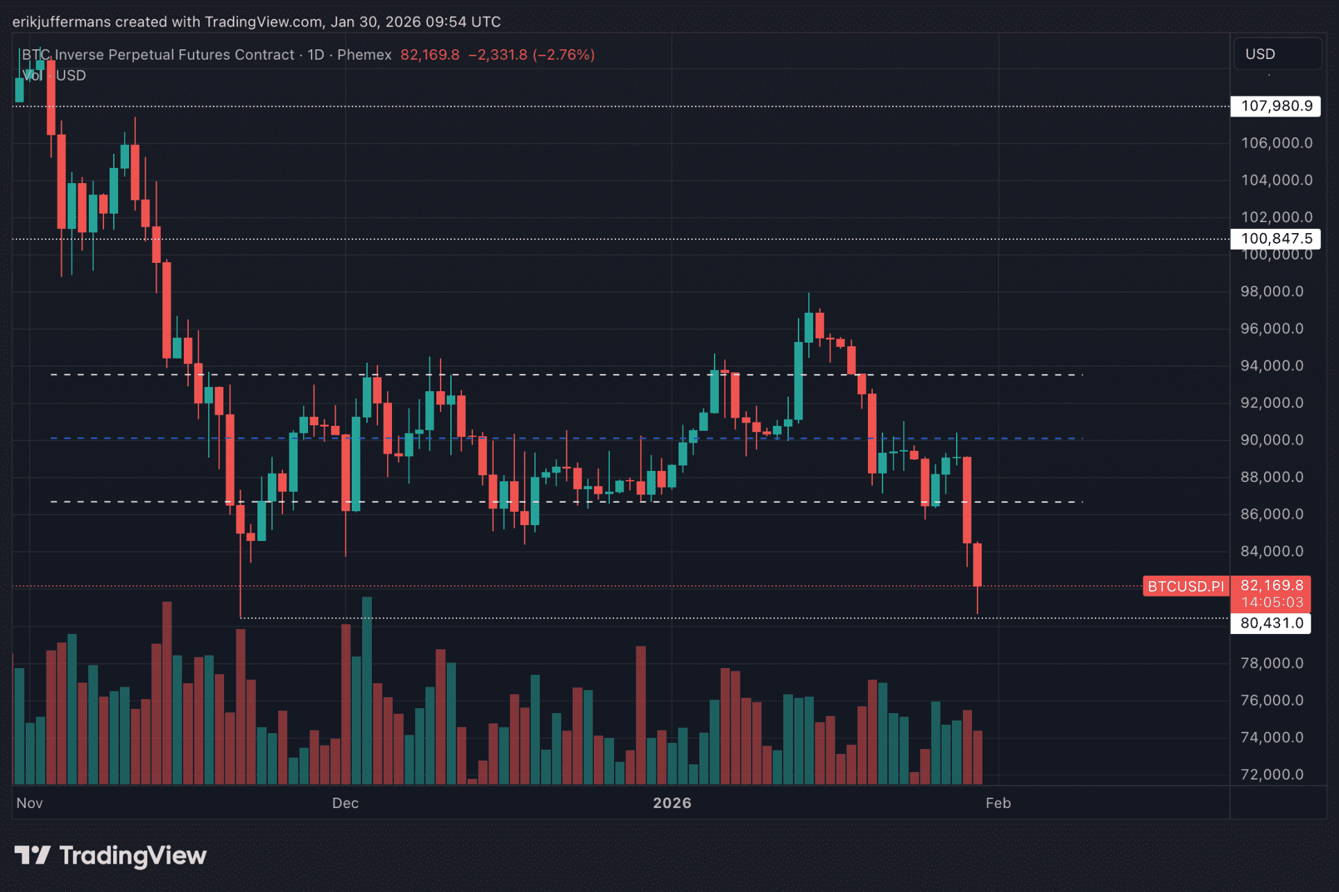 Desde noviembre, el precio de Bitcoin se movÃa principalmente dentro de un rango de precios claro. Esa fase de consolidación terminó abruptamente con una llamada trampa alcista, seguida de una fuerte caÃda por debajo del lÃmite inferior del rango. BTC descendió rápidamente hacia los 80.000 dólares, un nivel alcanzado por última vez el 21 de noviembre.