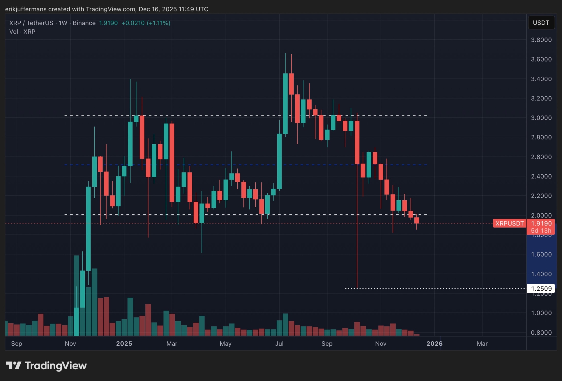 Sin embargo, el gráfico semanal es más relevante en este contexto. Desde que XRP se mueve en el rango actual, ninguna vela semanal ha abierto y cerrado por debajo de los 2 dólares. Si XRP cerrara esta semana por debajo de ese nivel, sería la primera vez que ocurre y una señal claramente bajista.