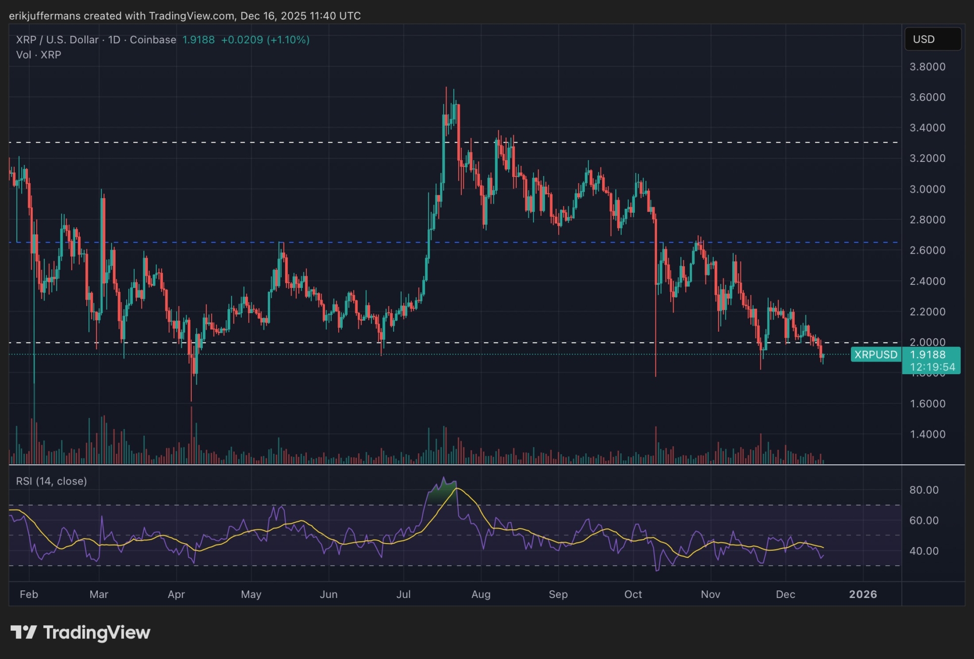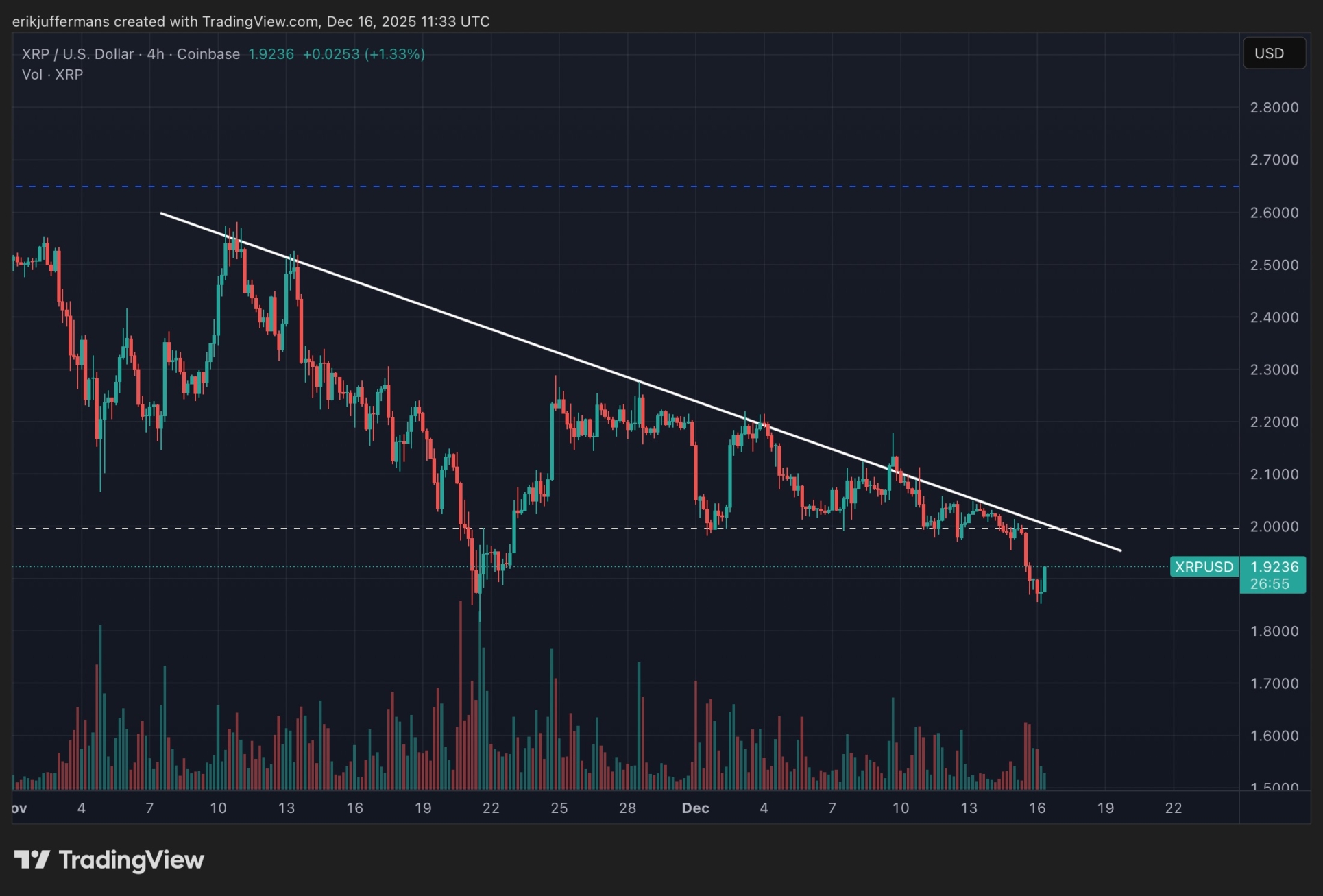 Ripple (XRP) vuelve a cotizar por debajo de los 2 dólares. Con ello, el precio pierde un nivel psicológico crucial y se mueve ahora sobre hielo muy fino. Una caída por debajo de los 2 dólares abre la puerta a una posible corrección mucho más profunda. El analista técnico de Newsbit, Erik Juffermans, comparte sus expectativas.