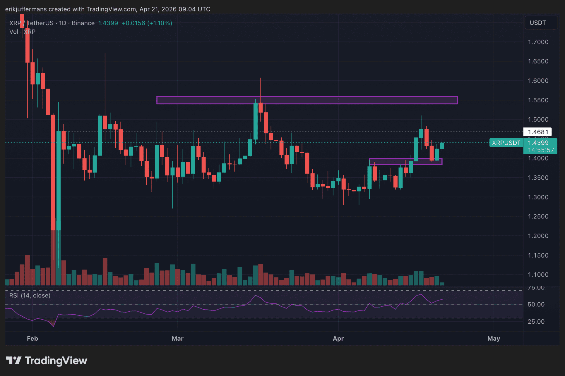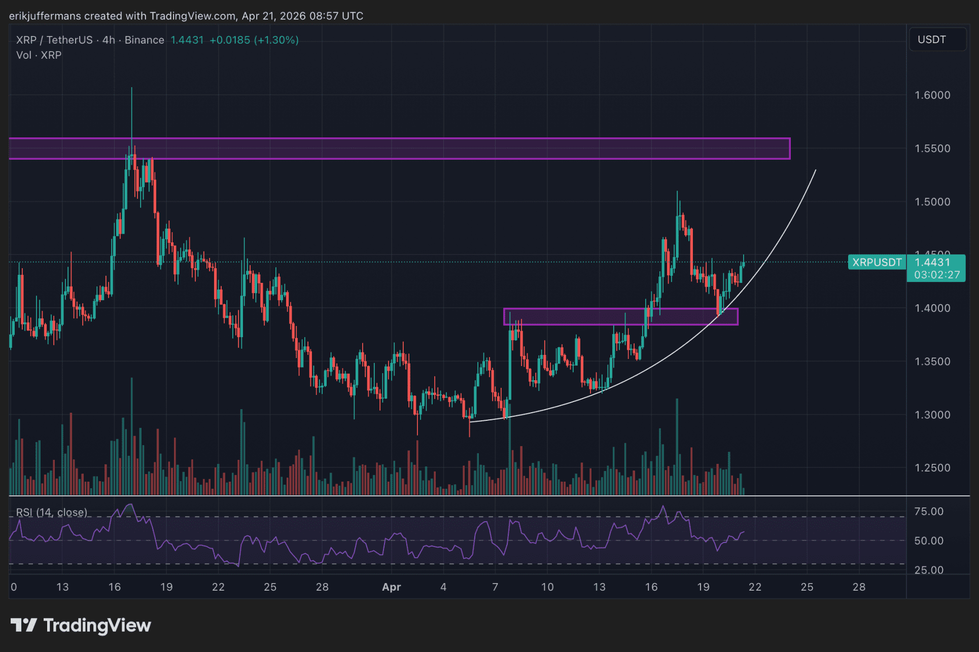 A corto plazo, el precio del XRP se ve alcista. Se observa una clara tendencia ascendente con máximos y mínimos cada vez más altos. La caída del domingo pasado a 1,40 dólares resultó ser una exitosa retest de la anterior zona de resistencia.