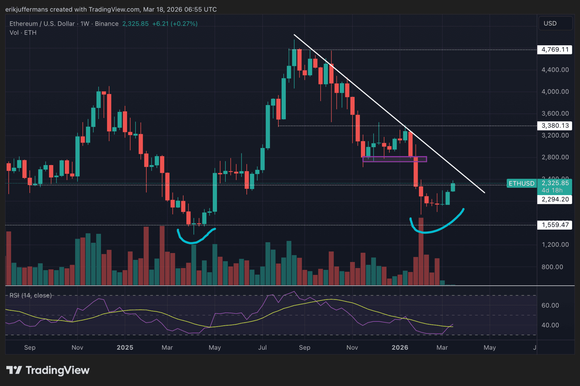 Las fluctuaciones diarias desvían la atención del panorama más amplio. En el gráfico semanal, según Juffermans, Ethereum se dirige hacia los 2.800 dólares, el nivel de resistencia significativo más reciente.