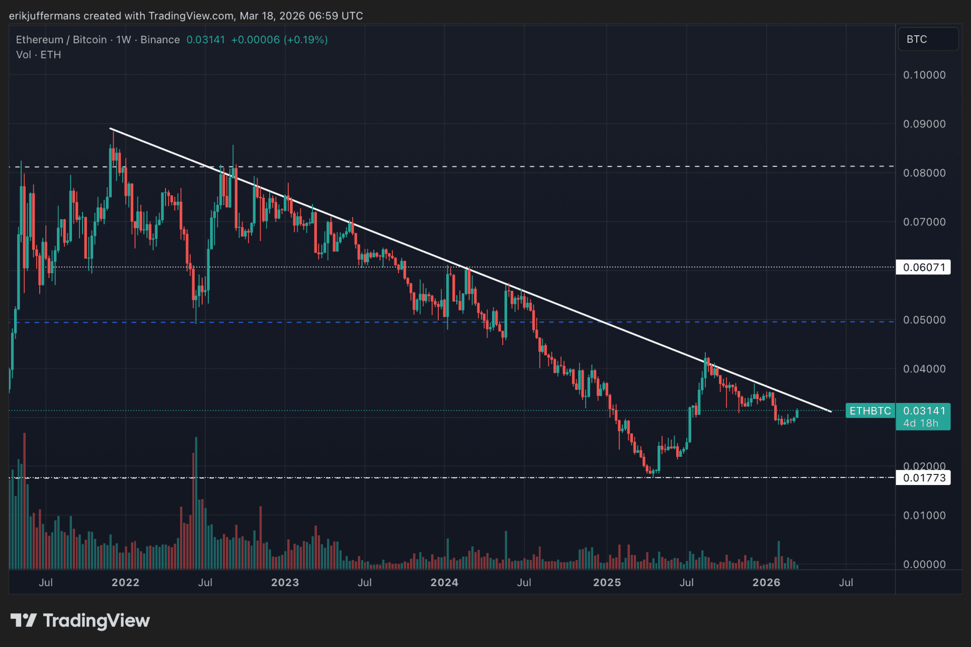 El gráfico ETH/BTC, que muestra el valor de Ethereum en relación con Bitcoin (BTC), ha estado en una clara tendencia descendente desde finales de 2021. Ethereum ha estado perdiendo valor relativo frente a BTC durante más de tres años. Una ruptura de la línea de tendencia descendente en este gráfico sería una señal de que este equilibrio comienza a cambiar.