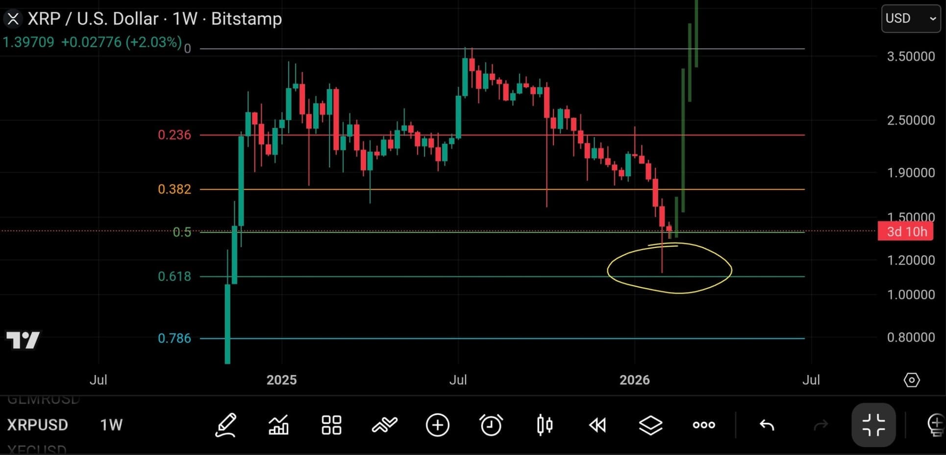 El nivel 0.618 es especialmente destacado, según el analista XRP Captain. A menudo se considera una zona clave donde los compradores se activan. Recientemente, el precio de XRP cayó bruscamente hasta esta región, pero luego se recuperó de manera convincente.