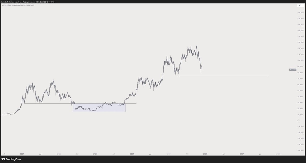 Según él, el nivel de 75,000 dólares en 2026 equivale al nivel de 30,000 dólares en 2022. Si Bitcoin cae por debajo de este nivel, se podría esperar una fuerte caída hacia los 60,000 dólares, según el analista.