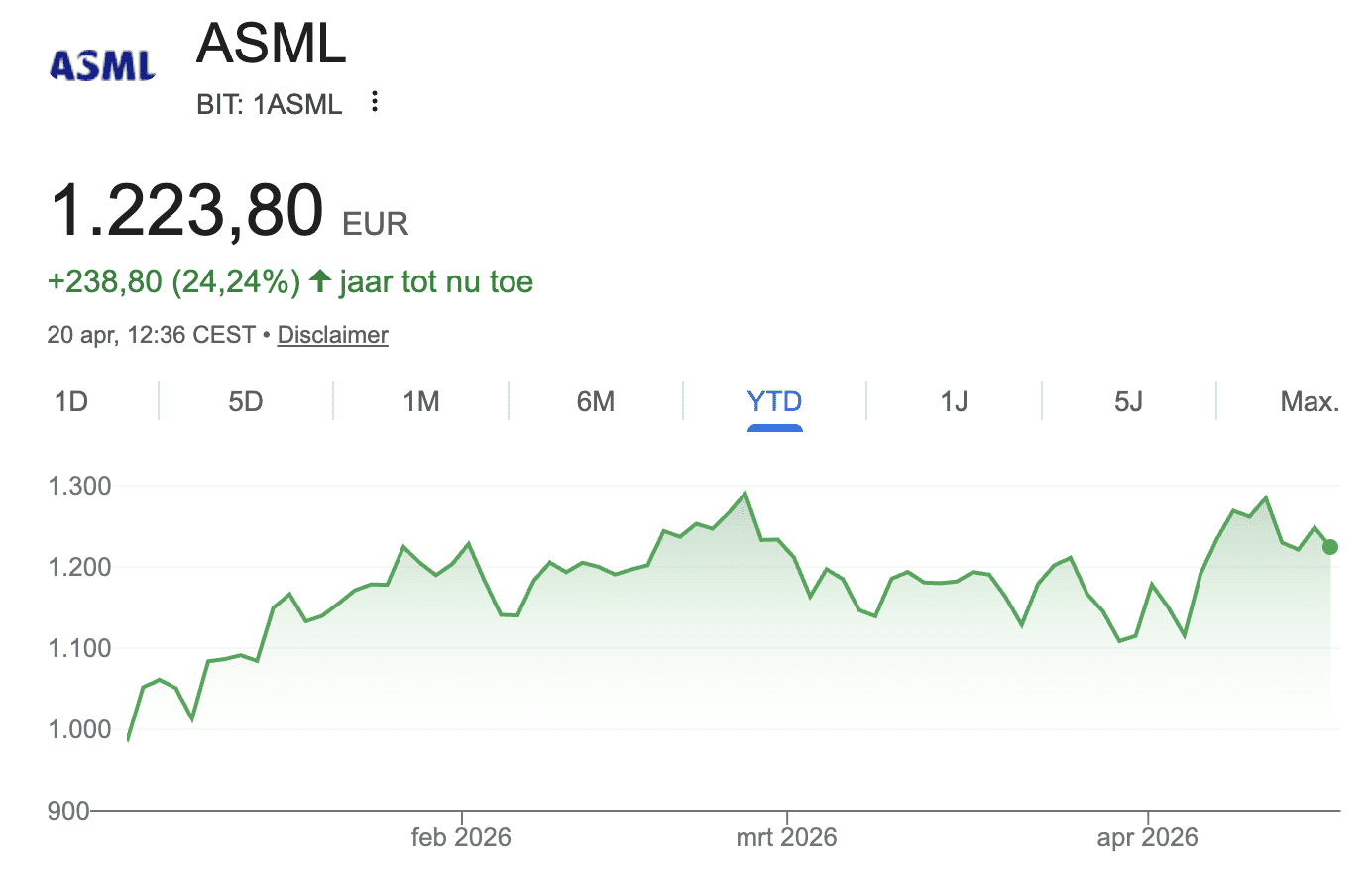 El dividendo llega tras un sólido inicio de 2026. Las acciones de ASML han subido aproximadamente un 24% este año, desde unos 985 euros a principios de enero hasta 1.225 euros. Quienes compraron cien acciones a principio de año por alrededor de 98.500 euros, ahora tienen una posición valorada en 122.500 euros. Incluyendo los dos pagos de dividendos que suman 4,30 euros por acción, el rendimiento total supera los 24.400 euros.
