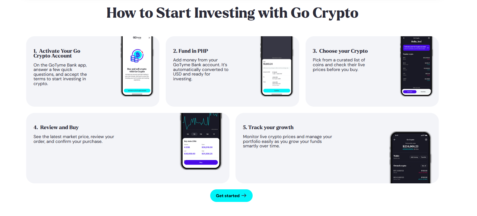 GoTyme utiliza una integración con la empresa fintech estadounidense Alpaca. En total, los usuarios pueden comprar y almacenar once tokens digitales, incluyendo Bitcoin, Ethereum, Solana y Polkadot. Las compras se realizan automáticamente a través de la conversión de pesos filipinos a dólares estadounidenses.