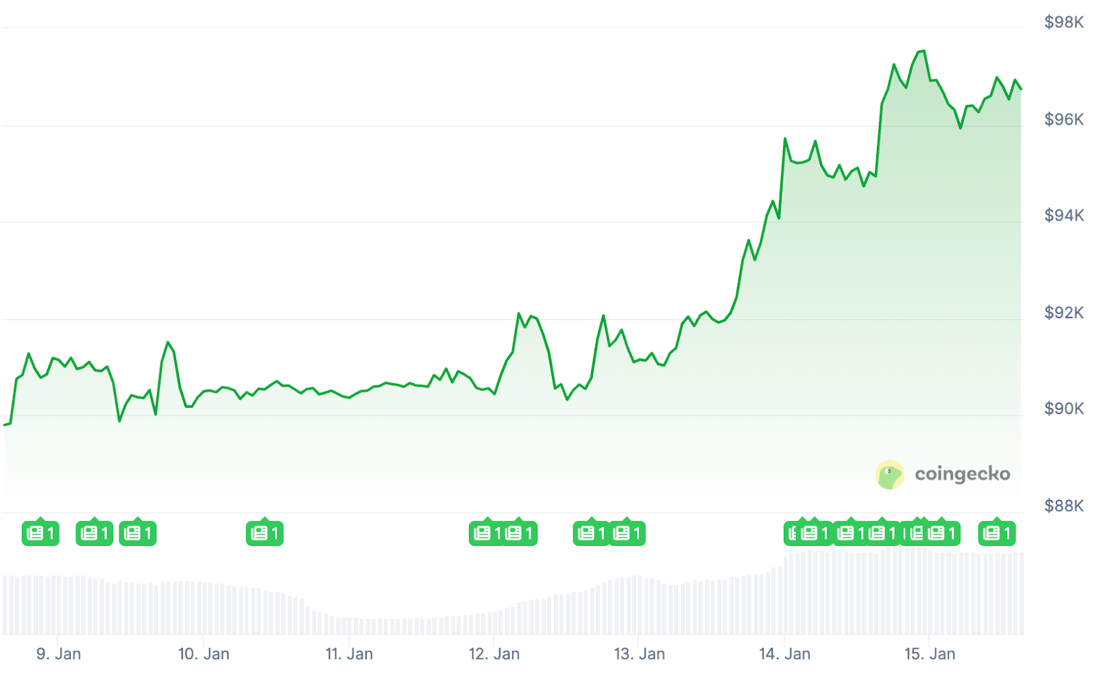 Bitcoin está en una fuerte tendencia al alza. Tras un incremento del siete coma ocho por ciento en la última semana, BTC cotiza en torno a los 96.800 dólares. Este es el nivel más alto desde noviembre.