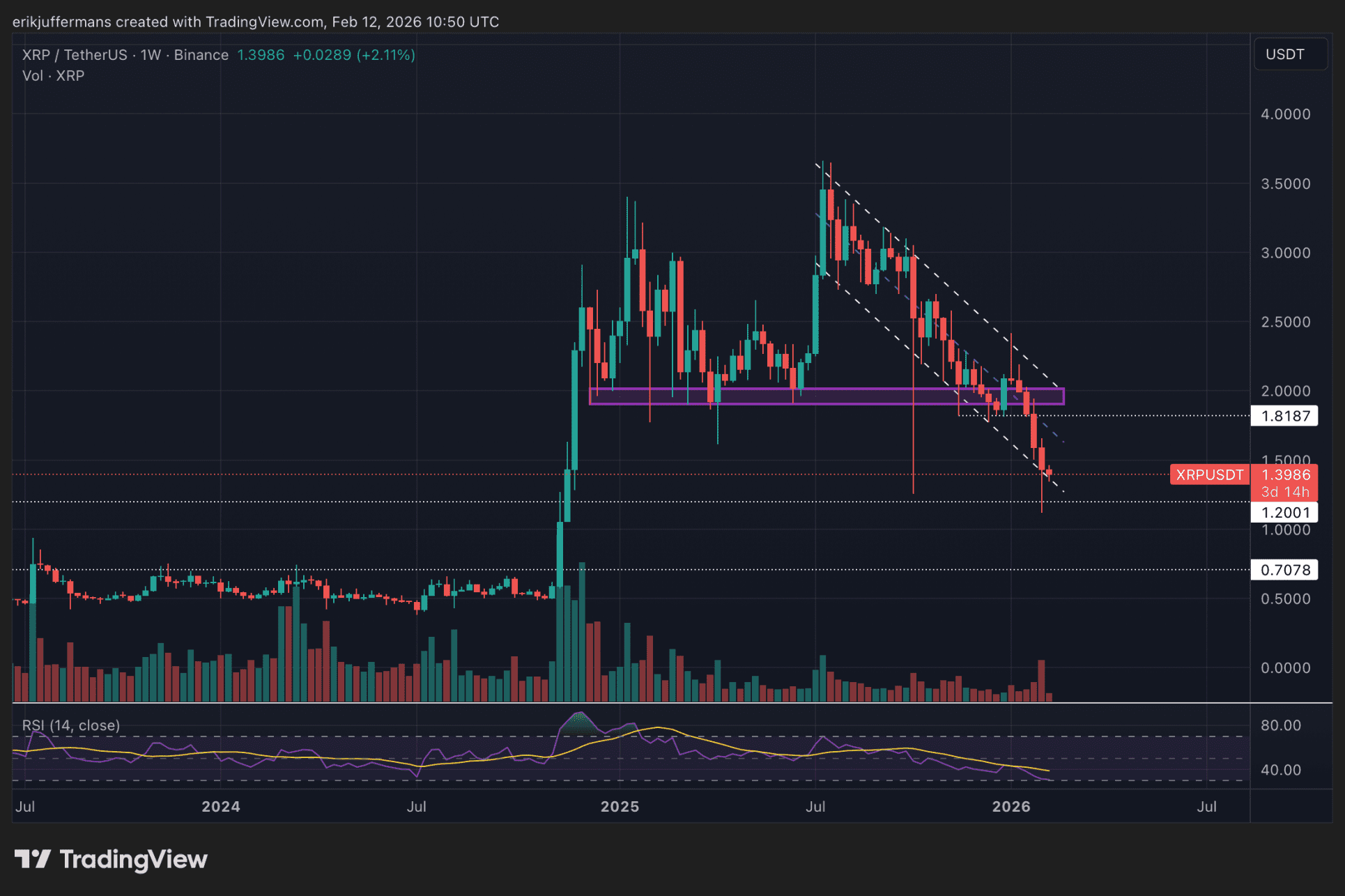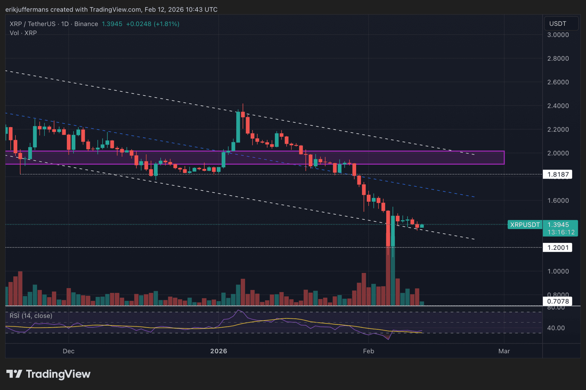 Después de que XRP perdiera el soporte alrededor de 1,80 dólares a finales del mes pasado, el descenso fue rápido. La cotización cayó en picado hasta 1,20 dólares, un nivel que habÃamos mencionado en análisis anteriores como el escenario bajista extremo.