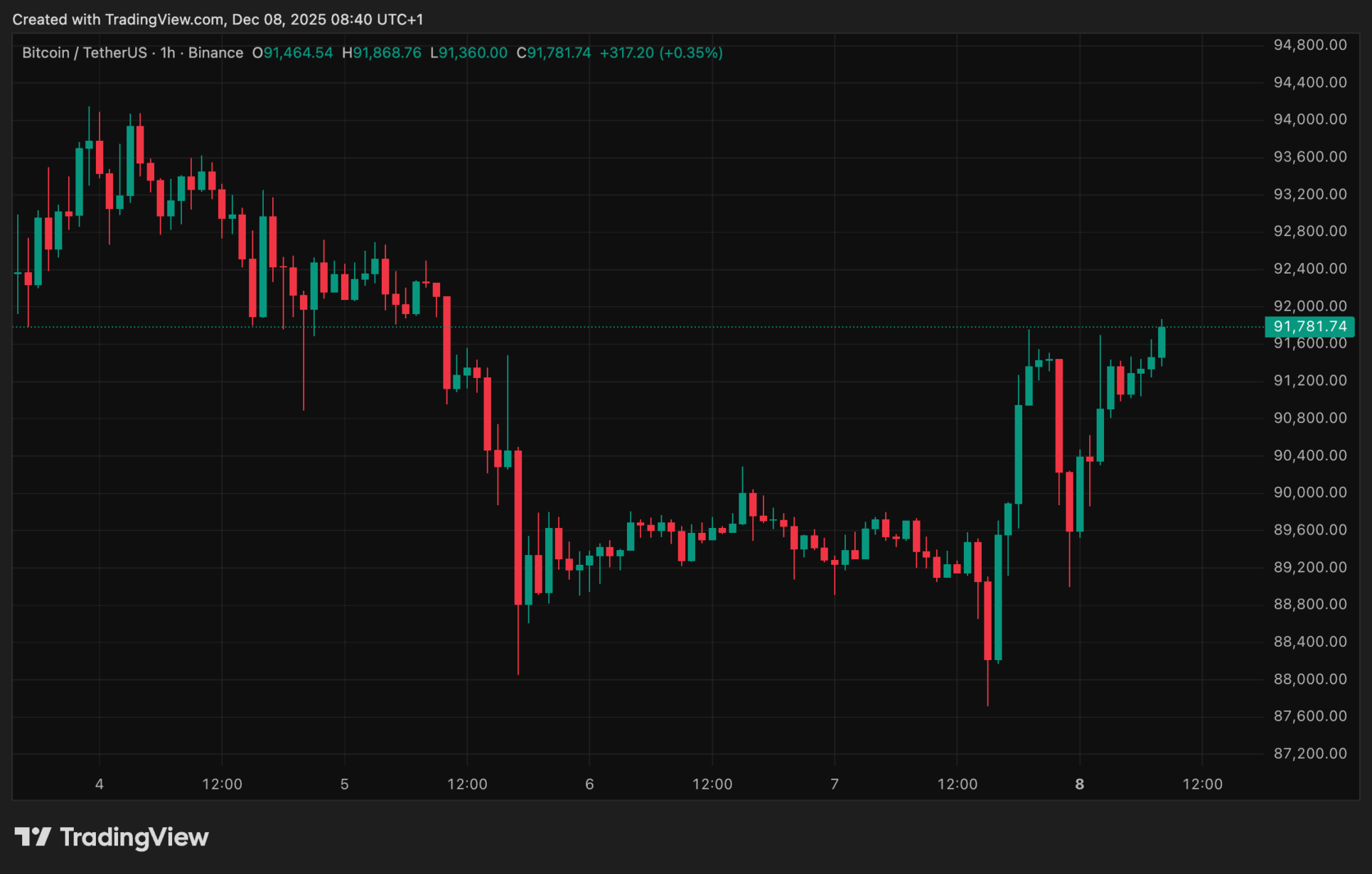 El mercado cripto inicia la semana en verde. Bitcoin (BTC) se recuperó por encima de los 91,500 dólares, mientras que altcoins como Ethereum (ETH), XRP y Cardano (ADA) también muestran ganancias significativas.