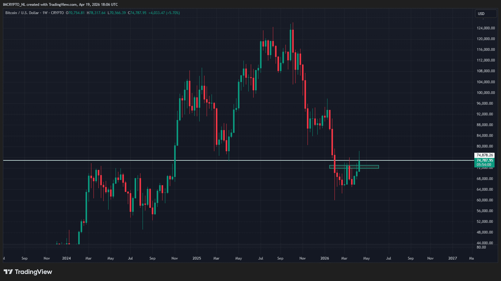 En medio de las renovadas tensiones, debemos esperar que Bitcoin cierre hoy por encima de los 74,600 dólares. Ese fue el punto más bajo en abril del año pasado, cuando los mercados financieros se tambalearon por la guerra comercial de Trump. De lo contrario, podría caer aún más hasta el próximo soporte alrededor de los 72,000 dólares.